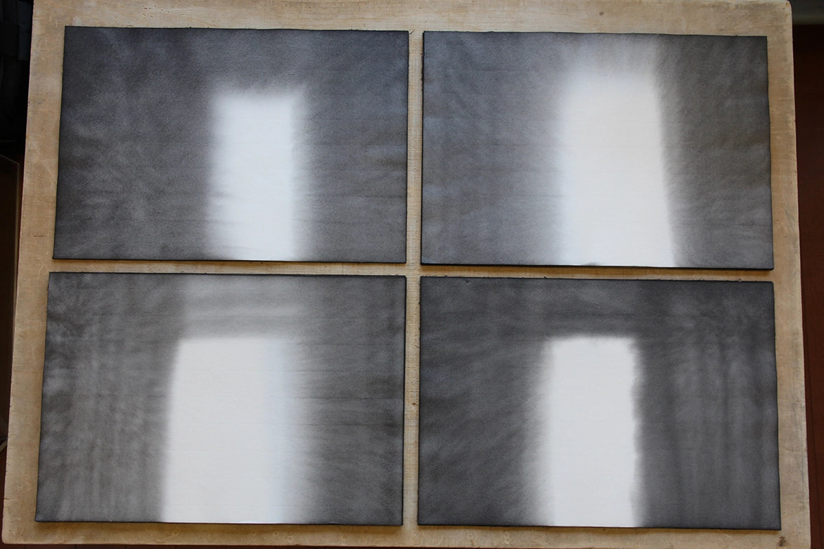 作品の背景は、まずアーティスト自身が一枚一枚、刷毛で墨を施して制作する