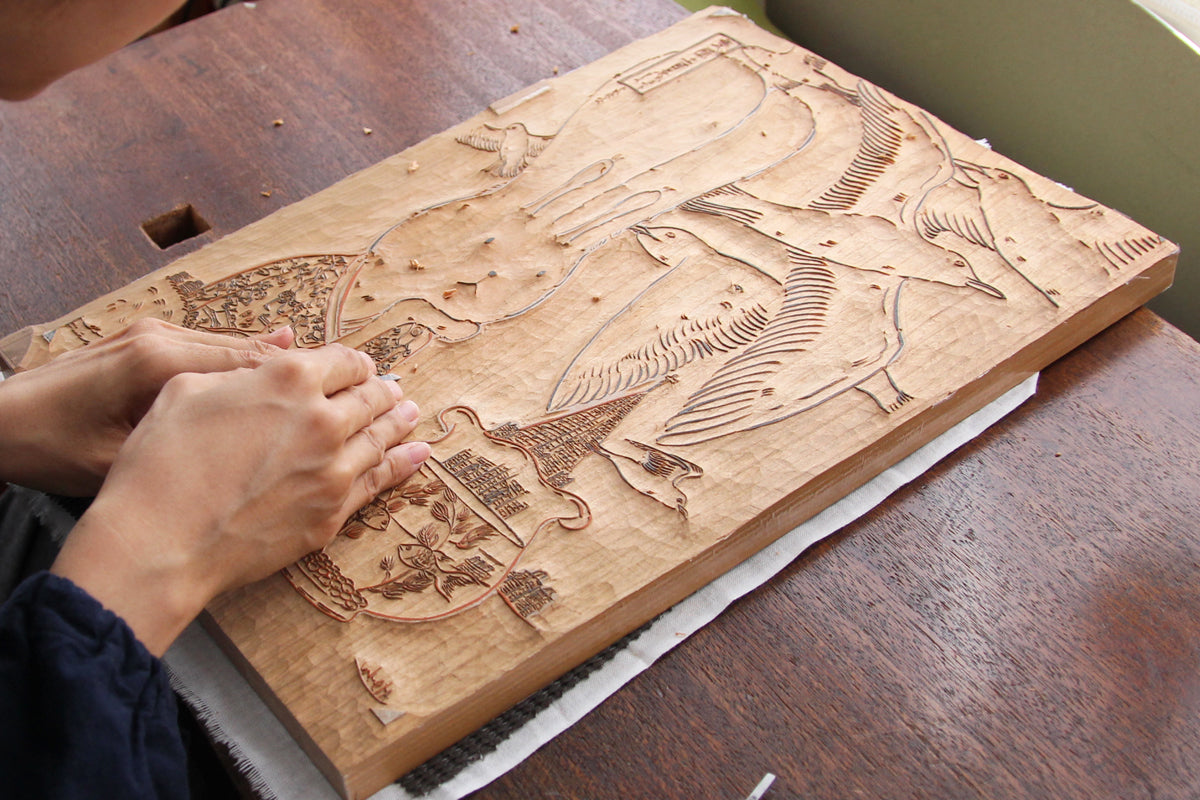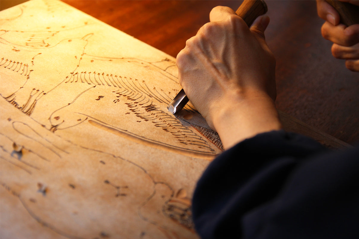 彫の命とも言われる小刀を自在に操り、堅い山桜の版木をリズミカルに彫りすすめる彫師。Kaga氏が原画を描く際に特に重視したという浮世絵木版画のための「線の表現」に忠実に彫りあげています。