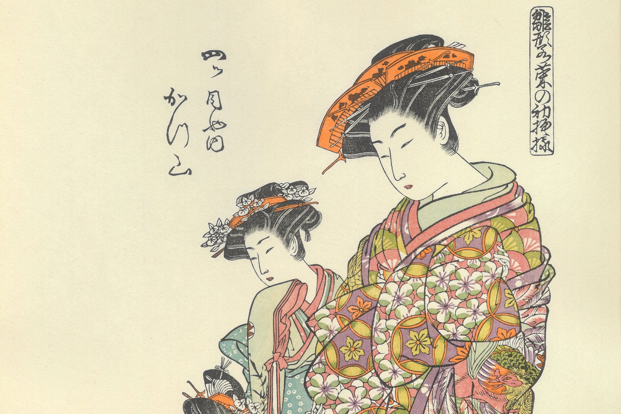 錦絵の代表作は、安永6(1777)年から、蔦屋重三郎と西村屋与八の共同出版でスタートした「雛形若菜の初模様」。趣向をこらした衣裳を身にまとう遊女たちの華やかな姿が好評を博し、100図を超える大シリーズとなりました。また庶民が家の柱に飾って楽しんだ「柱絵判」の作品を数多く手がけ、晩年は活動の基盤を肉筆画に移し、品格のある美人画を描きました。