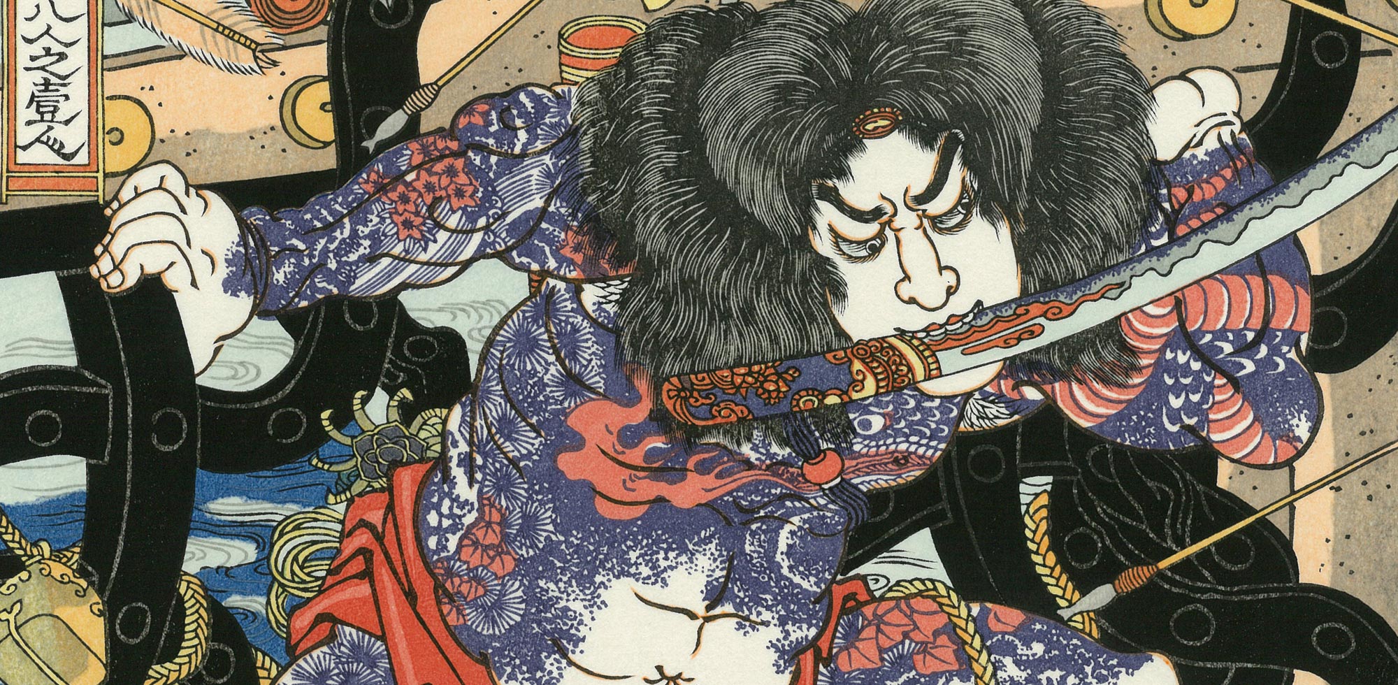 中国から伝わった「水滸伝」が日本でベストセラーとなった際、その登場人物たちをいち早く錦絵に描いたのは国芳でした。張順(浪裡白跳)や阮小五(短命二郎)などのアウトローたちを力強く描き出した「通俗水滸伝豪傑百八人之壱人」シリーズは国芳の出世作となります。以降「武者絵の国芳」と評されるようになった国芳は、様々な物語に登場する豪傑や侠客を描いています。