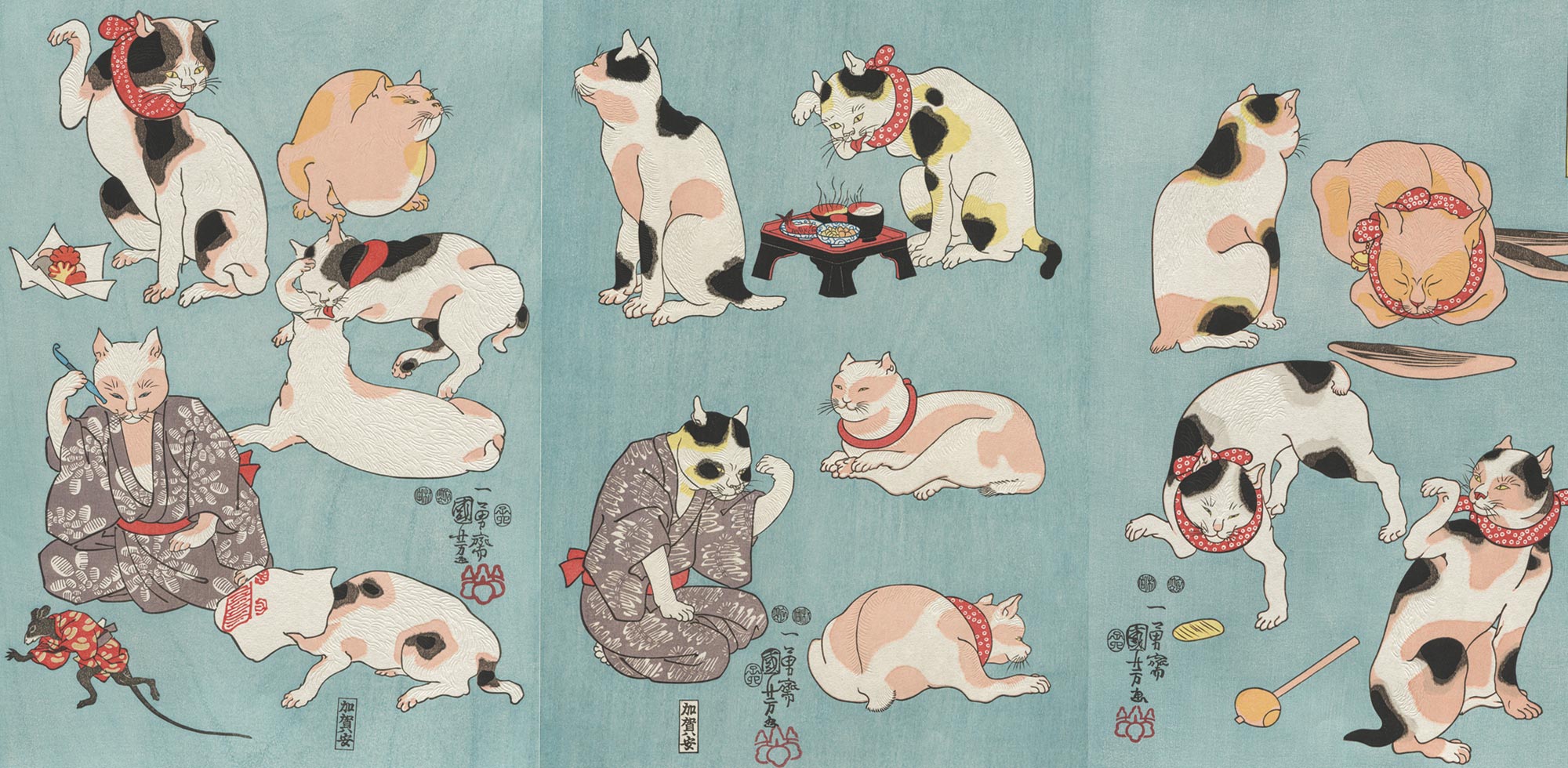 愛猫家で知られる国芳が描いた、リアルな仕草や表情が愛らしく魅力的な猫たち、そして、擬人化されたポップでコミカルなカワイイ金魚たち。どちらも、江戸時代の庶民の間で広く飼育されていた動物ですので、日頃かわいがっているペットたちの姿を遊び心たっぷりに描いた浮世絵に、江戸っ子たちは夢中になったに違いありません。