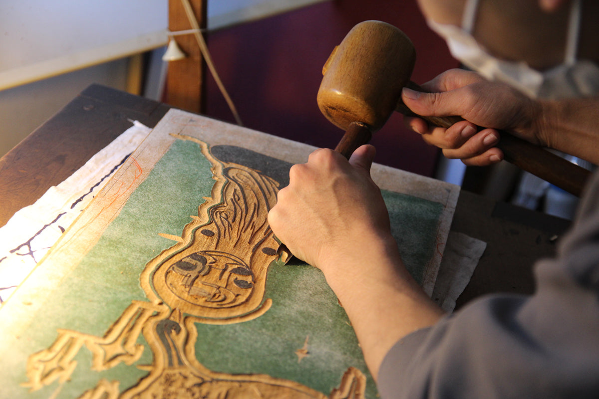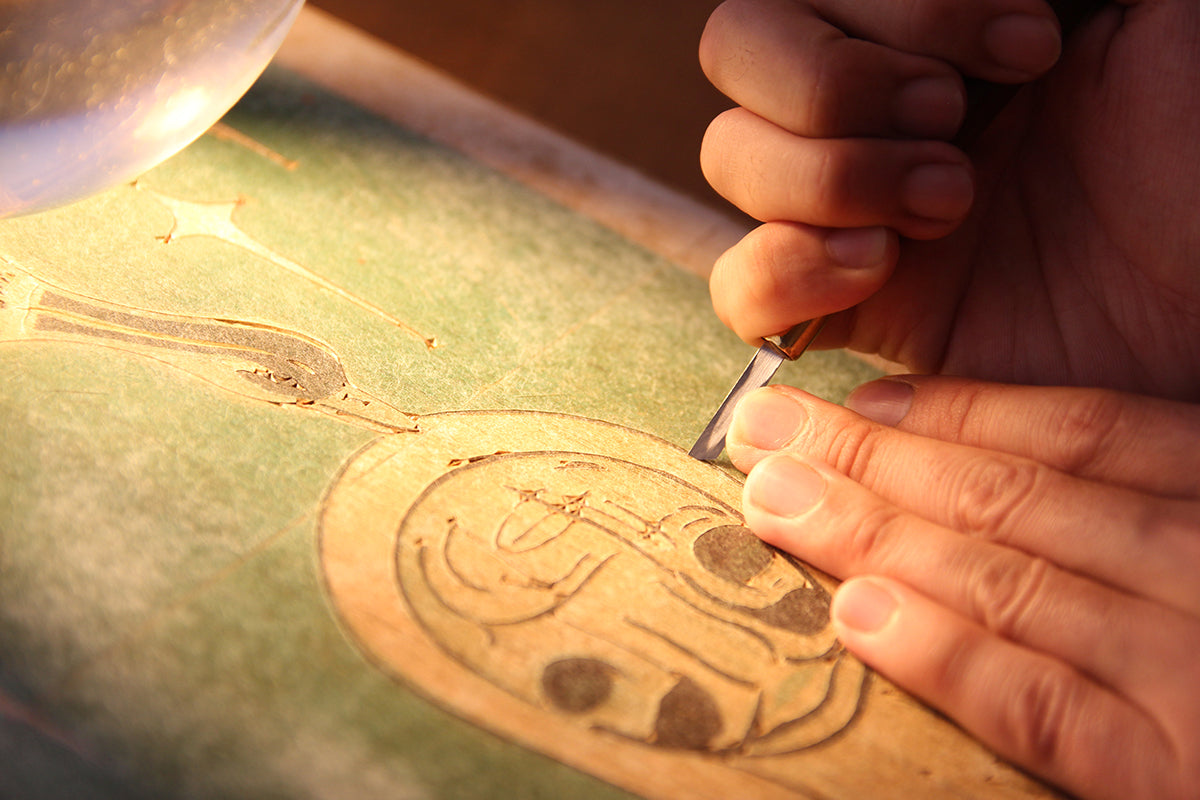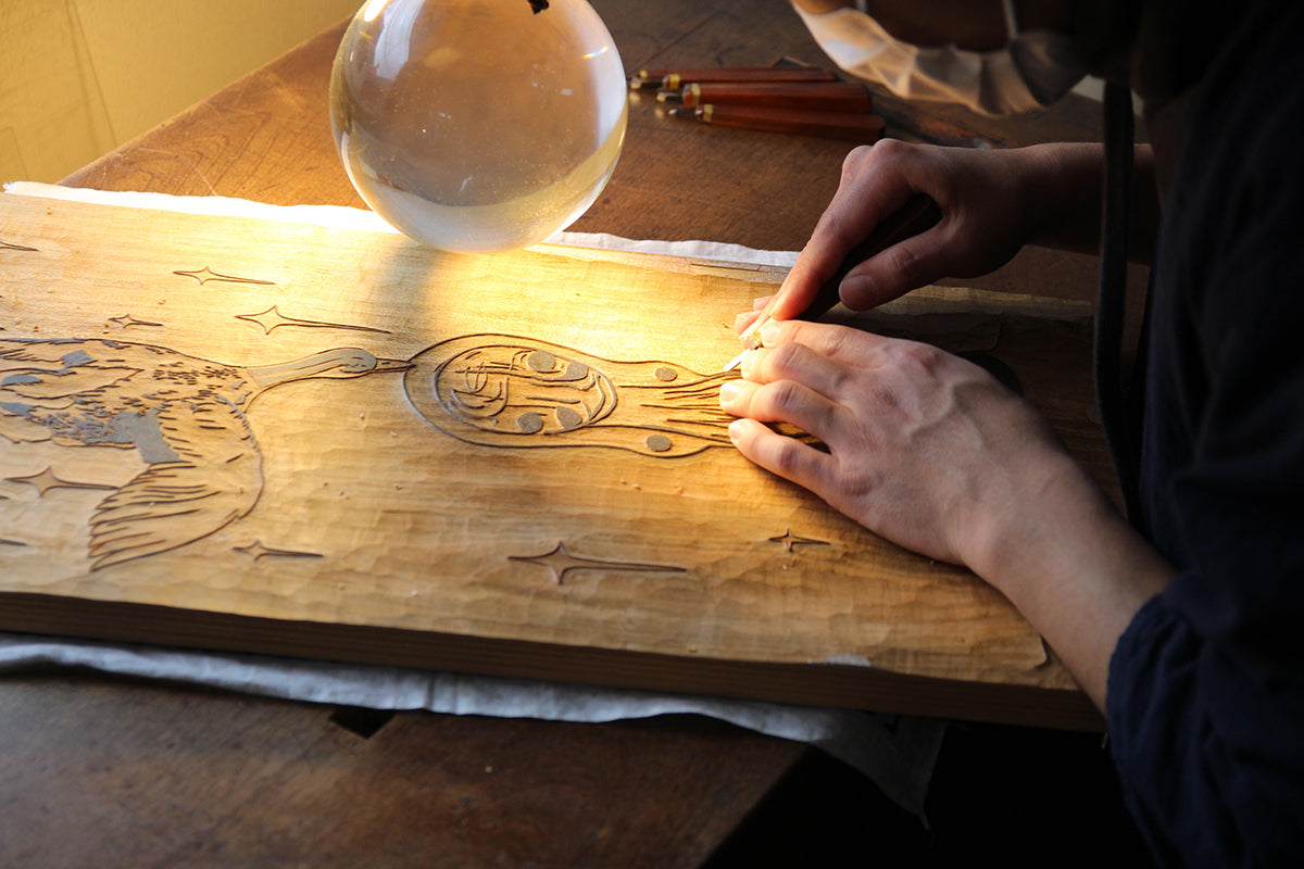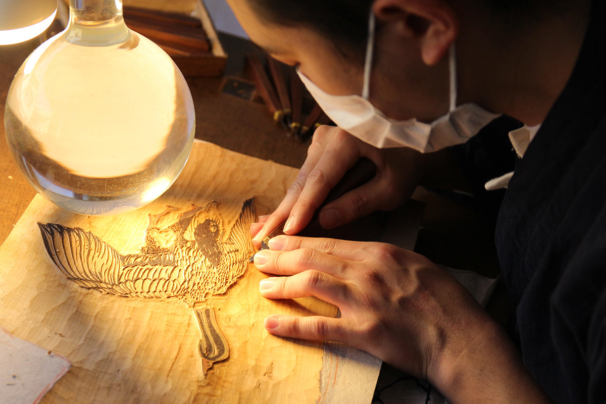 加藤氏の描くリズミカルで生き生きとした描線は、作品に力強い生命力を与えます。彫師は、線に込めた加藤氏の意図を忠実に汲み取り、彫りあげていきます。