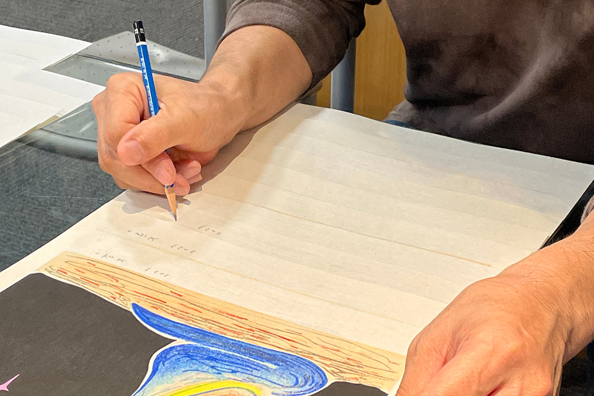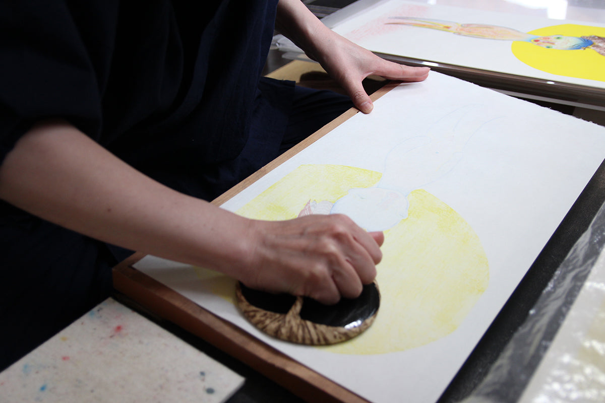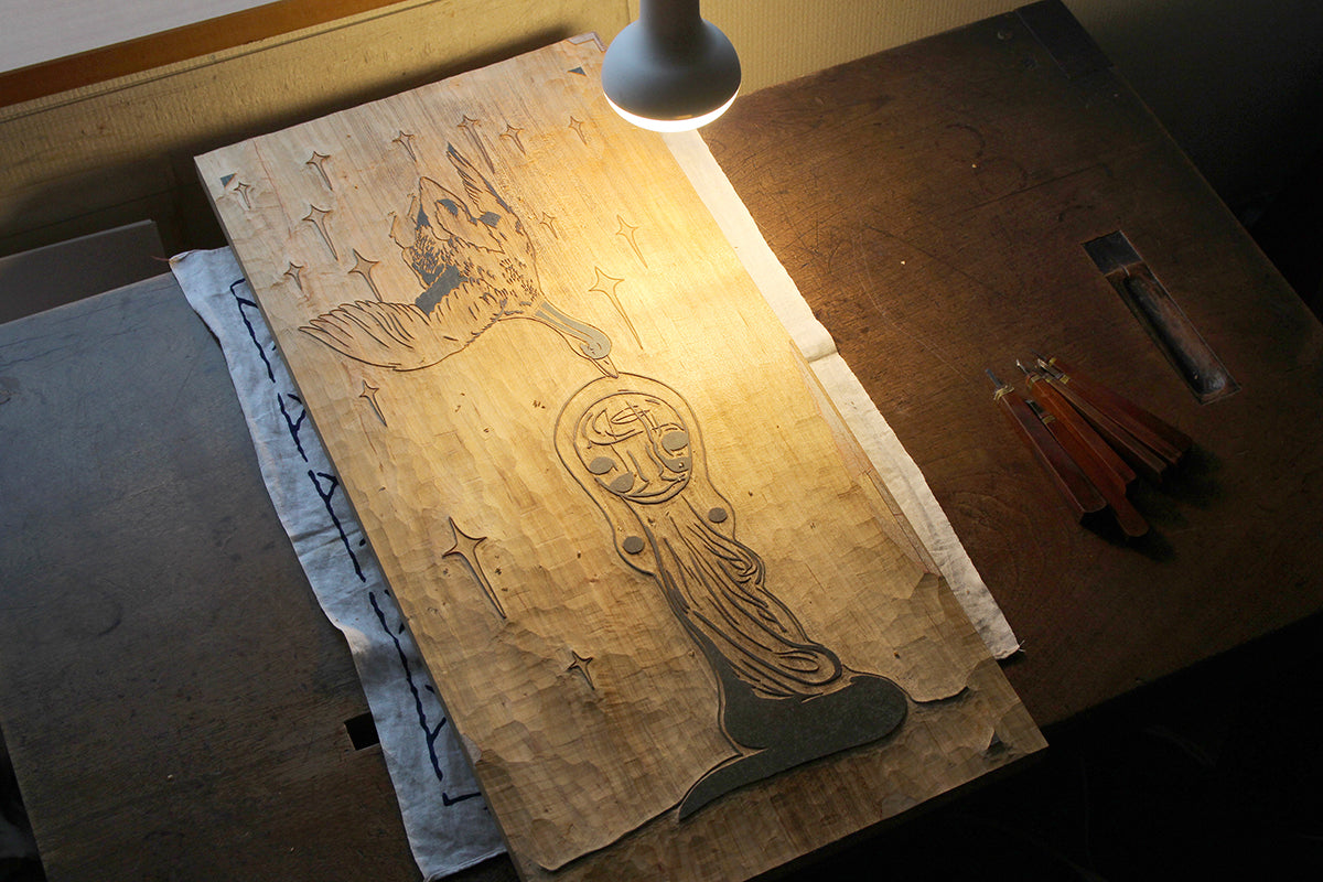 「今回、浮世絵を作る工房と仕事できたことは、また自分の制作の引き出しを増やせたような気がして、とてもいい経験でした。もちろん浮世絵版画のもつ繊細な技術に感動しましたが、僕の作品はもっとその技術とコラボレーションを進めることができると思っています。いわゆる浮世絵版画のものをつくるのではなく、浮世絵がさらに新鮮に感じる何かを表すことができるような気がしています。」