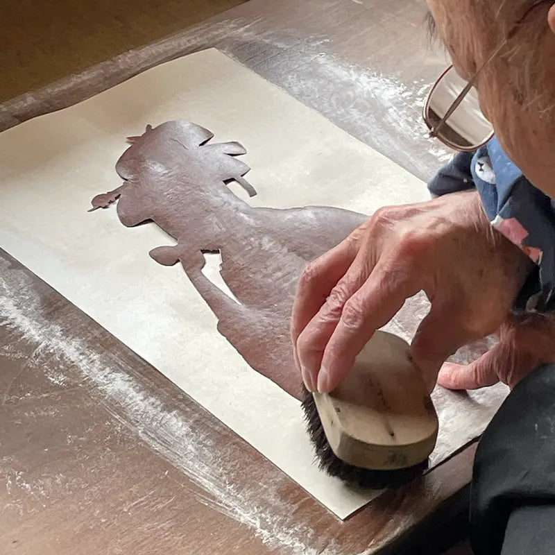 背景以外の人物の部分が隠れるように渋皮の型紙をあて、雲母(きら)を刷毛で引いていく「キラ引き」の様子