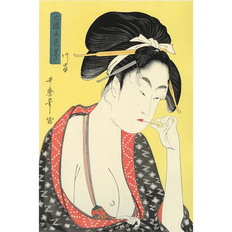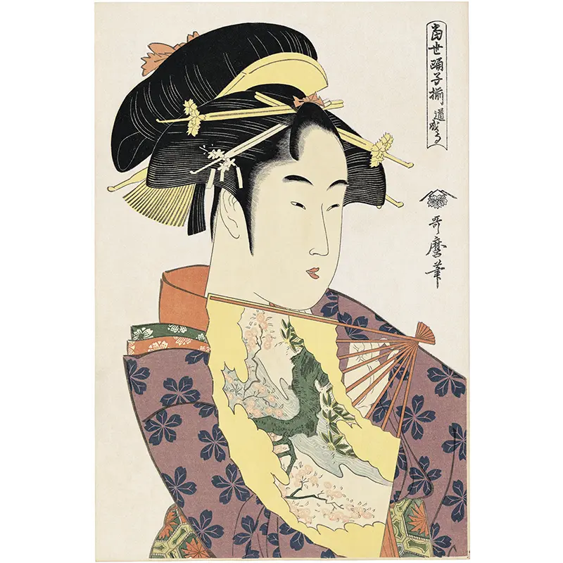 初め、狩野派の町絵師・鳥山石燕に学びましたが、版元・蔦屋重三郎に見出されて後、天明期より黄表紙の挿絵や錦絵を手がけるようになります。寛政期に入り、評判の町娘や遊里の女性たちを魅力的に描き、浮世絵美人画の第一人者としてその名を知らしめました。