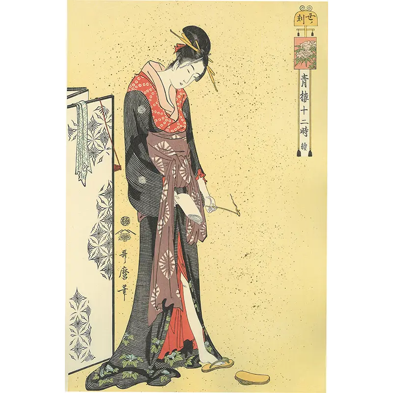 そして歌麿は、それらの表現方法を用いて、実在する様々な女性の真の姿を描こうとしました。吉原の遊女の一日を2時間毎に描いた12枚のシリーズ「青楼十二時(せいろうじゅうにとき)」は、華やかな吉原の表の顔だけではなく、遊女たちがふと見せる素顔を描き出しているとして評価の高い作品ですが、これは吉原に馴染みの深い蔦重と共に活躍する歌麿だからこそ描くことのできたシリーズと言えます。
