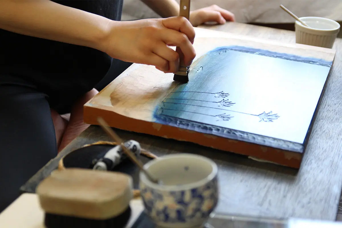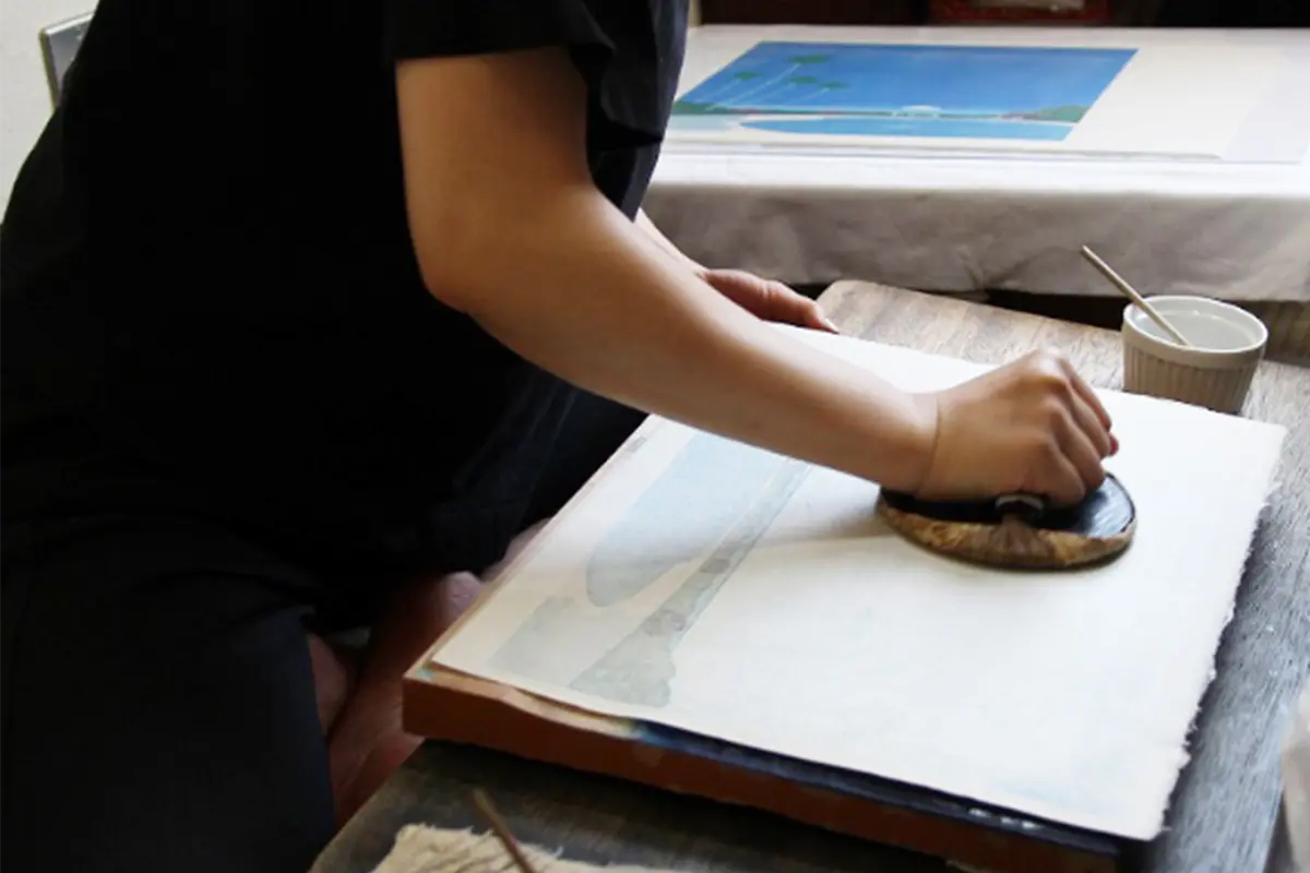 このたび、氏の代表作「Time goes by...」が、アダチ版画研究所の摺師と彫により木版画として完成しました。シンプルな画面の中に独特の世界観を生み出してきた氏の魅力が、伝統木版の技術によって余すところなく表現された作品です。