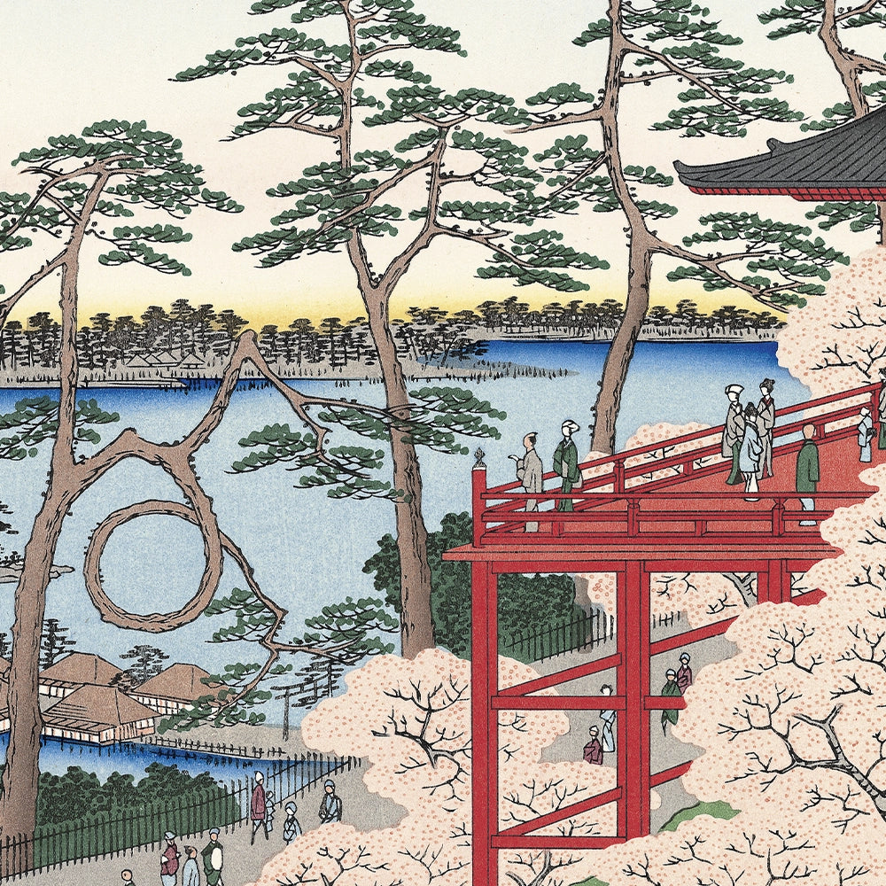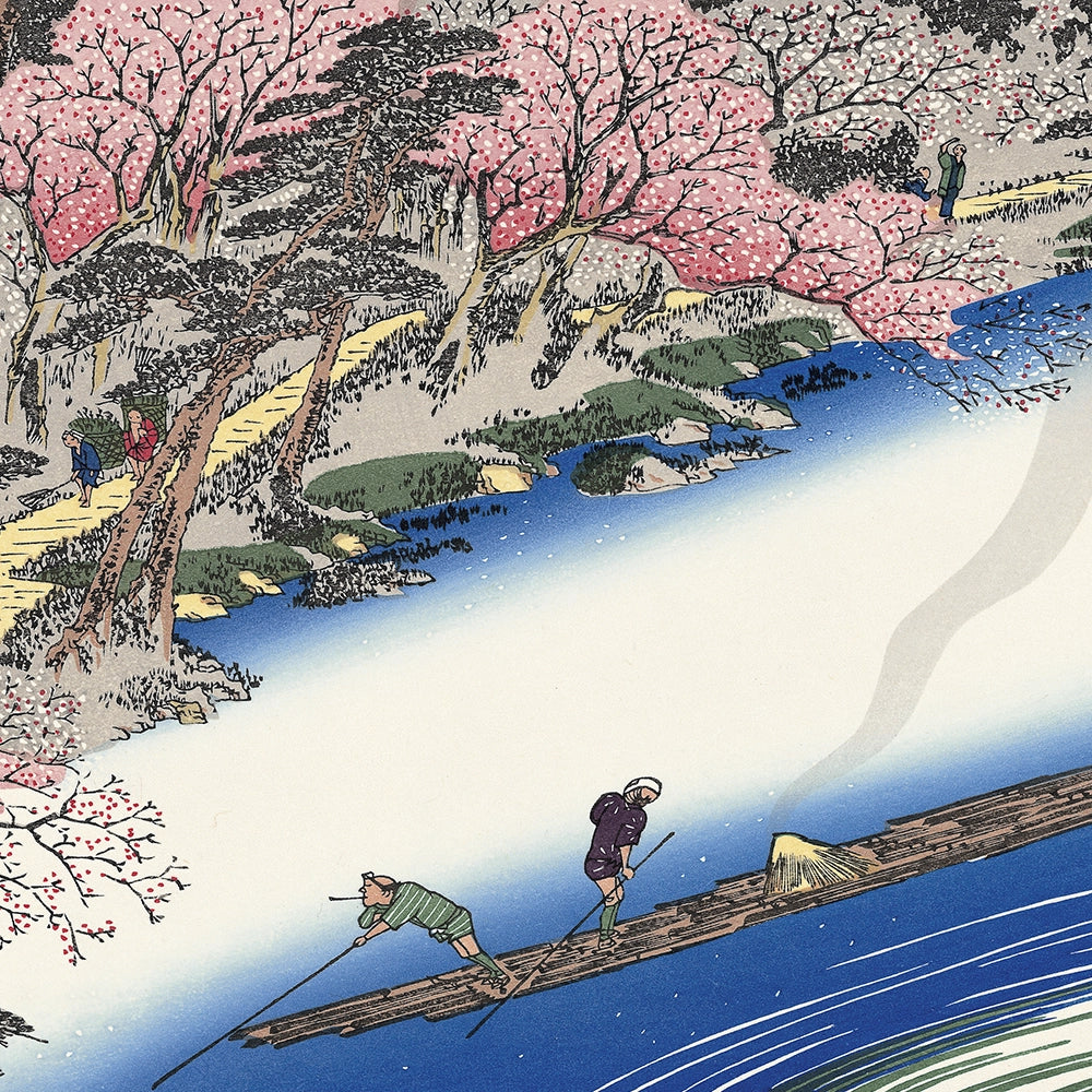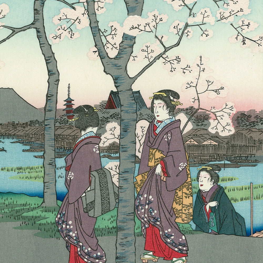 向島から水神の森と隅田川の対岸の真崎とを望んだ風景です。この水神は、水難、火難除けの神であり、船頭たちばかりでなく庶民の間でも厚い信仰を得ていました。隅田川の東岸の堤は、品川の御殿山や王子の飛鳥山と並ぶ桜の名所となっていました。全体に柔らかな色合いで、奥には筑波山も見えます。手前には里桜が美しく咲き乱れ、春爛漫の景色です。