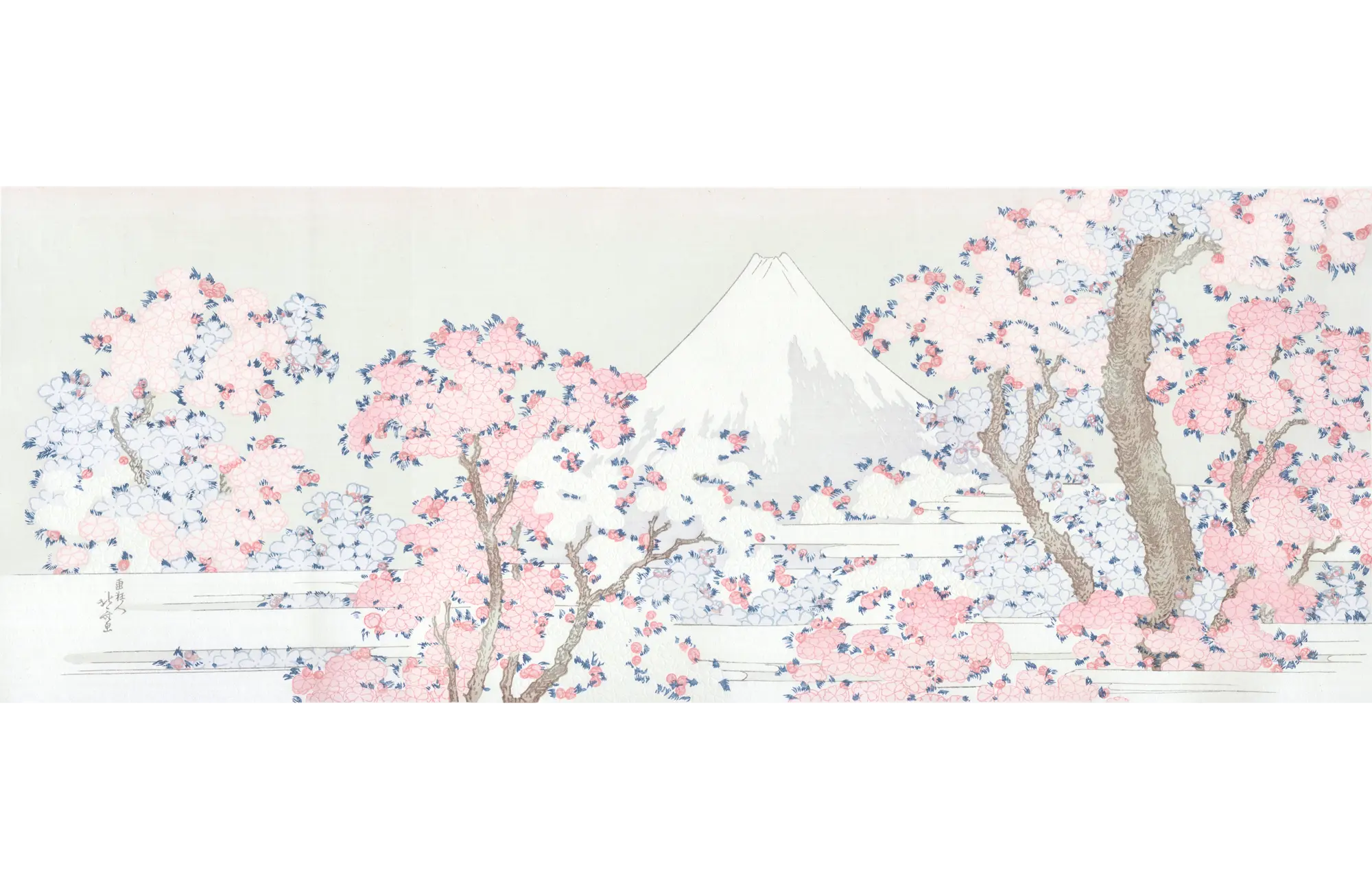 富士山を描かせて、北斎の右に出る者はいないでしょう。代表作「冨嶽三十六景」をはじめ、様々な富士の姿を描き続けた北斎。そんな"富士の絵師"北斎が描いた本図は、現存作例も極めて少ない知る人ぞ知る優品です。上品な色彩、空摺の多用など趣向を凝らし、贅を極めた特注品として、当時作られました。日本人の心象ともいうべき二大モティーフを巨匠・北斎が大らかに伸び伸びと描いた「桜花に富士図」。幾重にも重なる花びらの柔らかな線、春霞の空気を伝える透明感ある色彩。いつの時代も変わらない美しさを是非ご堪能ください。