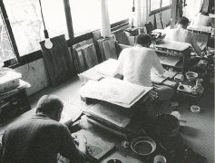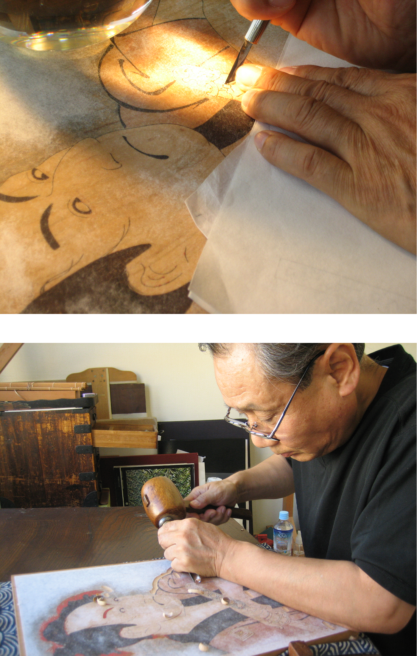 彫師歴60年になるアダチ版画研究所所属の新實(にいのみ)は、彫師の名人と言われた大倉半兵衛氏の「最後の弟子」として大倉氏が亡くなるまでの8年間彫師の修行をした後、1973(昭和48)年にアダチ版画研究所へ入りました。浮世絵の復刻版はもとより、日本画の巨匠の作品をはじめとする現代の木版画作品など多くの作品を手がけ、現在その力量は業界の第一人者として広く認められています。