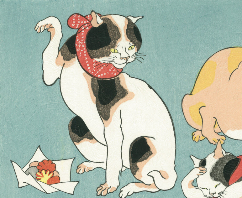 「ある時、神様が「1月1日の朝、1番から12番までに到着した動物を1年交代でその年の代表とする。」というお触れを出し、動物たちは我こそは!と一番乗りを目指して出発しまし、到着順に12匹の動物が決められました。しかし、なぜかネコは十二支には入っていません。それにはこんな理由が。。。神様の話を聞いていなかったネコが、ネズミに「集合は1月2日の朝!」と嘘を教えられてしまったから。そのため、ネコは十二支に入れませんでした。一方、まんまとネコをだましたネズミは、真面目なウシの背中でゆったりと揺られながら旅をし、集合場所に到着するやいなやウシの背中から飛び降りて、さっと一番になりました。」