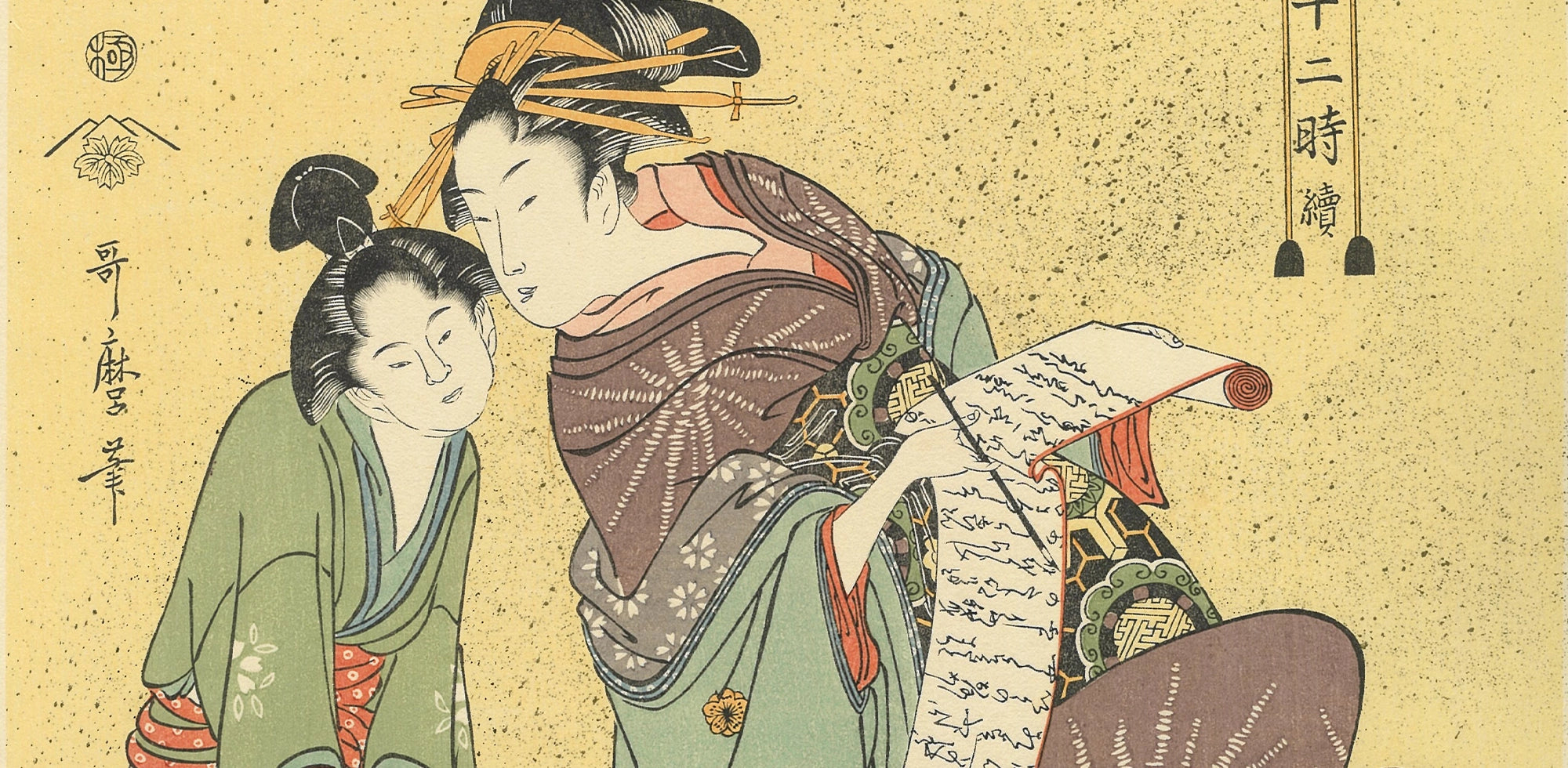 喜多川歌麿(1753-1806)による「青楼十二時」は版元・蔦屋から出版された、遊郭の一日を一刻ずつ(2時間ごと)描いた全12枚のシリーズです。「青楼」とは、新吉原の遊郭のこと。歌麿は、この新吉原の遊女たちを、黄潰しと砂子の背景に、十頭身のすらりとした全身像として描きました。遊郭の一日を時間の経過と共に描くことで、華やかな吉原の表の顔だけではなく、そこで働く遊女たちがふと見せる素顔をも描き出しています。歌麿の作品の中で唯一、遊女の実生活を描いた作品として、高く評価されているシリーズです。