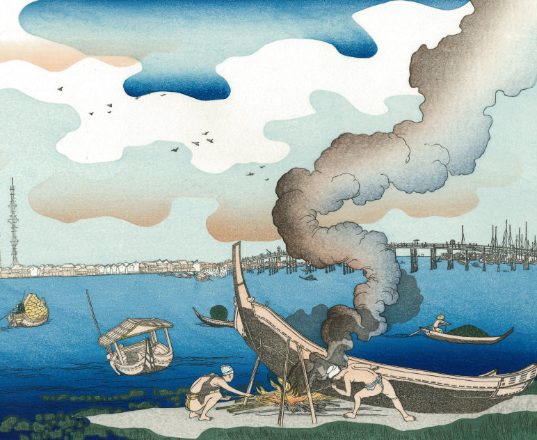 細密な筆致とは対照的に、人物の力強い動きは勢いのある太い線で表現されています。摺師は、細い線は潰れないよう丁寧に、太い線は力を入れてしっかりと、力の加減をしながら、国芳の描いた躍動感のある線を最大限生かすように摺っています。