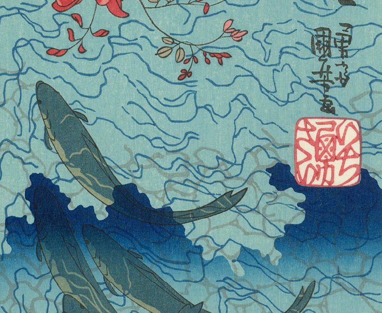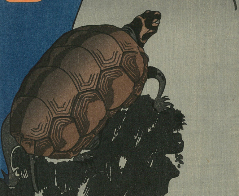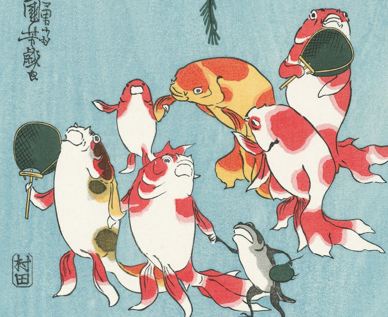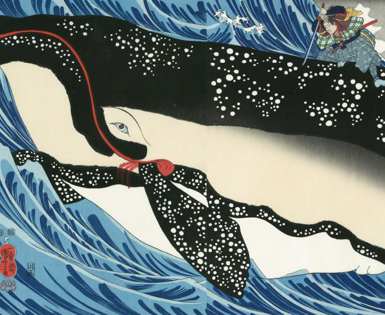 また、筋骨隆々の武者絵を描く一方で、自身の大好きな猫をはじめ、魚や狸などを擬人化したコミカルで愛らしい戯画も多く描きました。反骨と風刺の精神に富んだ作品群は、当時の人々の圧倒的支持を得、多くの門人が集まり、浮世絵師の最大派閥を形成。その系譜は昭和の日本画家まで連なっています。