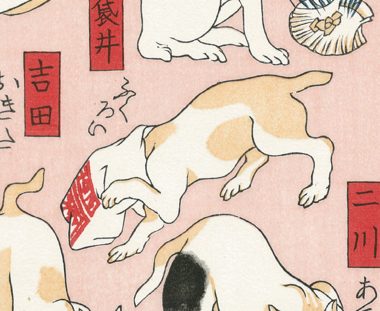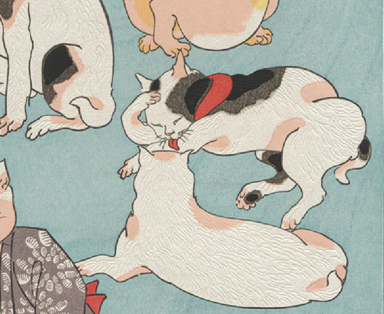 彫・摺の技術を駆使して繊細に表現された毛並みや、擬人化された姿などにも、日々猫たちと触れ合っていた国芳ならではの愛情のこもった視線が感じられます。