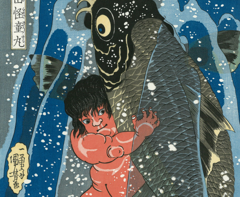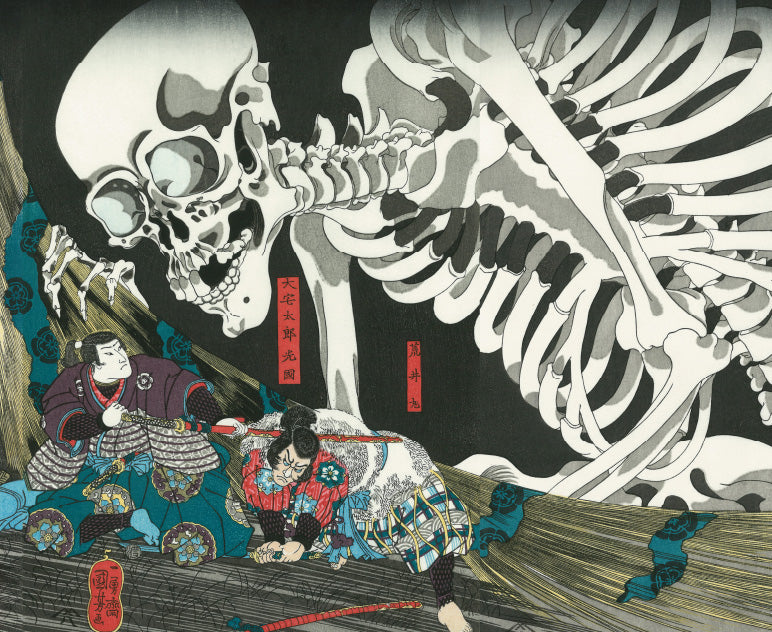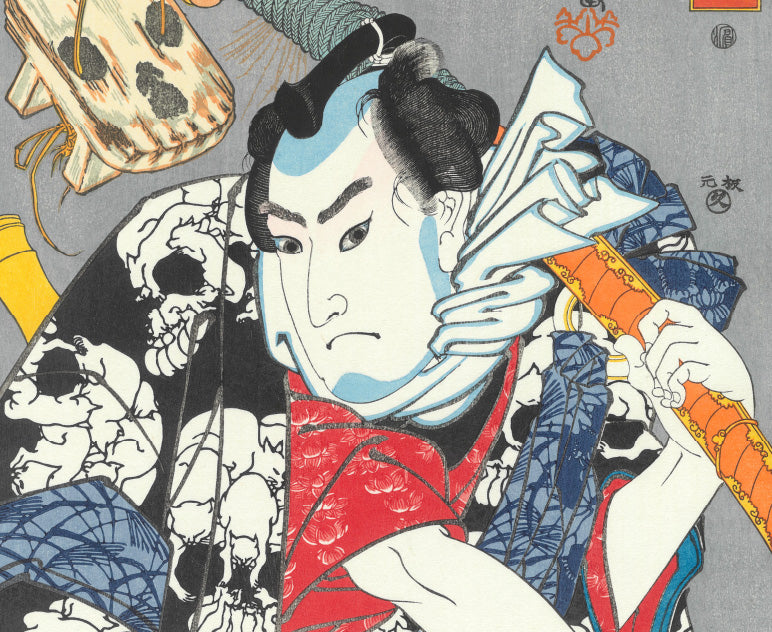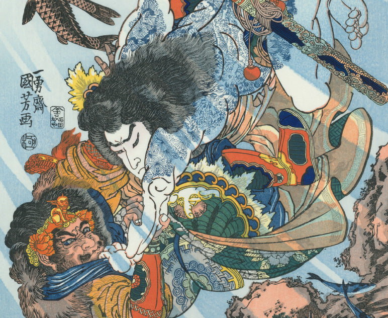 歌川国芳は、幕末に活躍した浮世絵師です。そのユニークな画風から、「奇想の絵師」などと呼ばれ、近年再評価の気運が高まり、広い世代の人気を集めています。幼少の頃より画才に優れた国芳は、15歳で歌川豊国の門下となりました。二十代の内は目立った活動はありませんでしたが、30歳を過ぎ、水滸伝の英雄に取材した一連の作品で脚光を浴びました。当時の浮世絵師の番付には、名所絵の広重に対し、武者絵の国芳として名前が掲げられています。