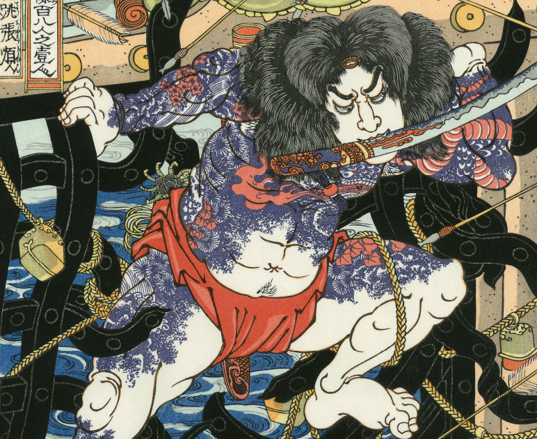 豪傑たちの体に描かれた華やかな刺青や、細い線で表現された髪の毛は、ぜひ注目していただきたいポイント。熟練の技術を要する緻密な彫は、まさに彫師の腕の見せどころです。