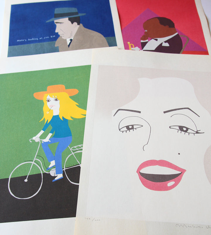 木版画となった「六星座」シリーズでは、「カサブランカ」のハンフリーボガード、「私生活」のブリジット·バルドーといったように、映画に精通した和田氏らしく、各役者そしてその役柄の特徴を十分に捉えて描いています。 誰を描いても、常に優しく、温かい、和田氏の人柄がにじみ出た似顔絵は、見る人を和ませてくれます。