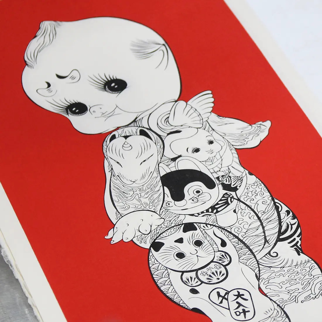 We are pleased to announce the release of "Talisman -hare, ke-", a woodcut print by artist Kumi Machida. The work presents the same design in two versions, one with a red background and one with a white background, showing how changes in ink and paper tone made possible by printmaking can transform an image. The prints are available either as a set of 2 or individually.