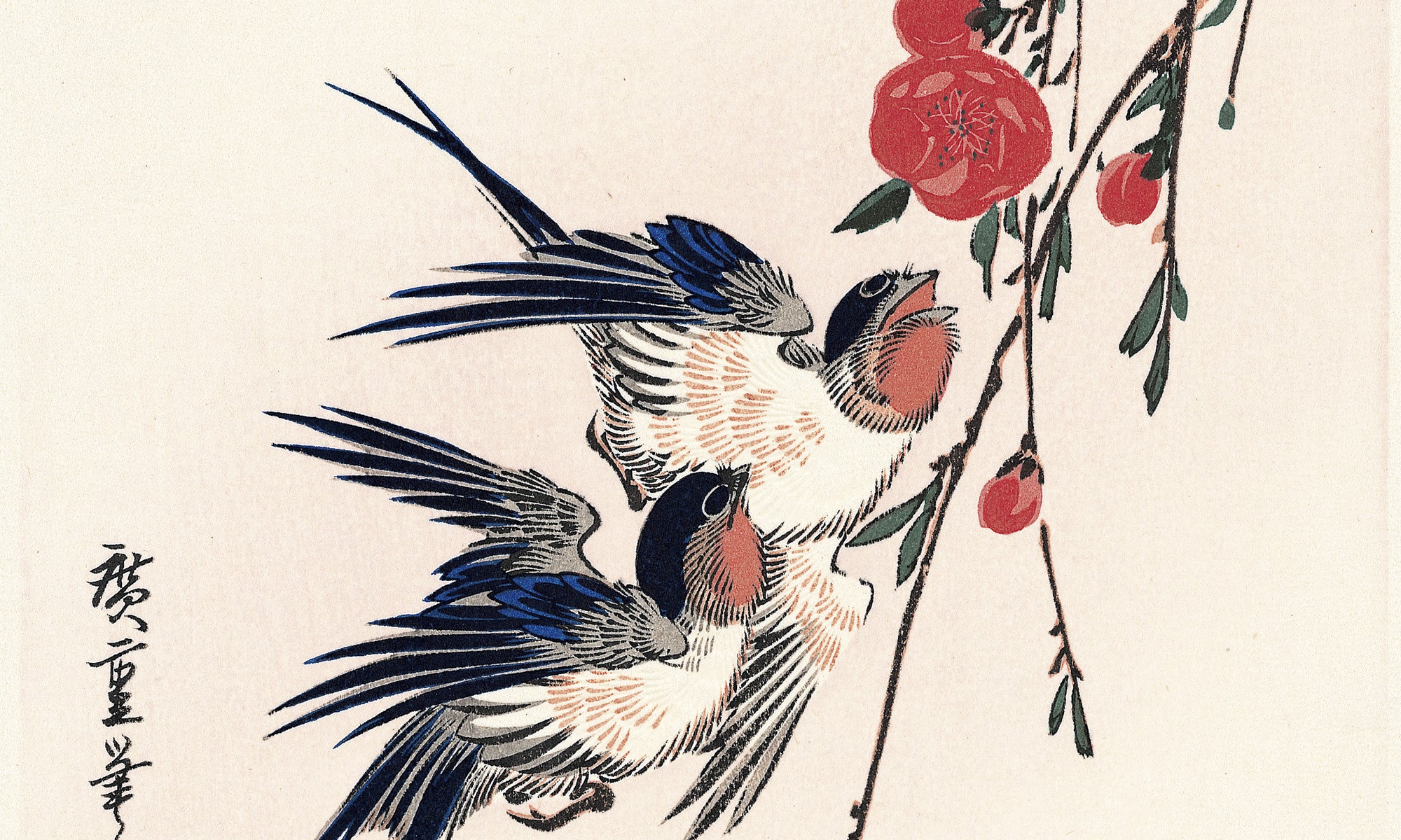 The atomosphere of a moonlight night in spring is deftly represented in this print. At the top right the full moon can be seen through the foliage, hinting at a further expanse of sky. The vehement flapping of their wings by two swallows may interrupt the quiet dream of the peach blossoms. A seven-character verse is presented at the top-left.