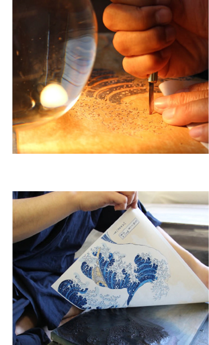Adachi selects the same traditional materials that were used in the Edo period as much as possible such as woodblocks made from mountain cherry tree or traditional Japanese hand-made papers called Kizuki hosho, made by Mr. Ichibei Iwano who is a living national treasure. Also Mineral and botanical pigments are mainly used. Printers work hard to create desirable beautiful colors for the best result.