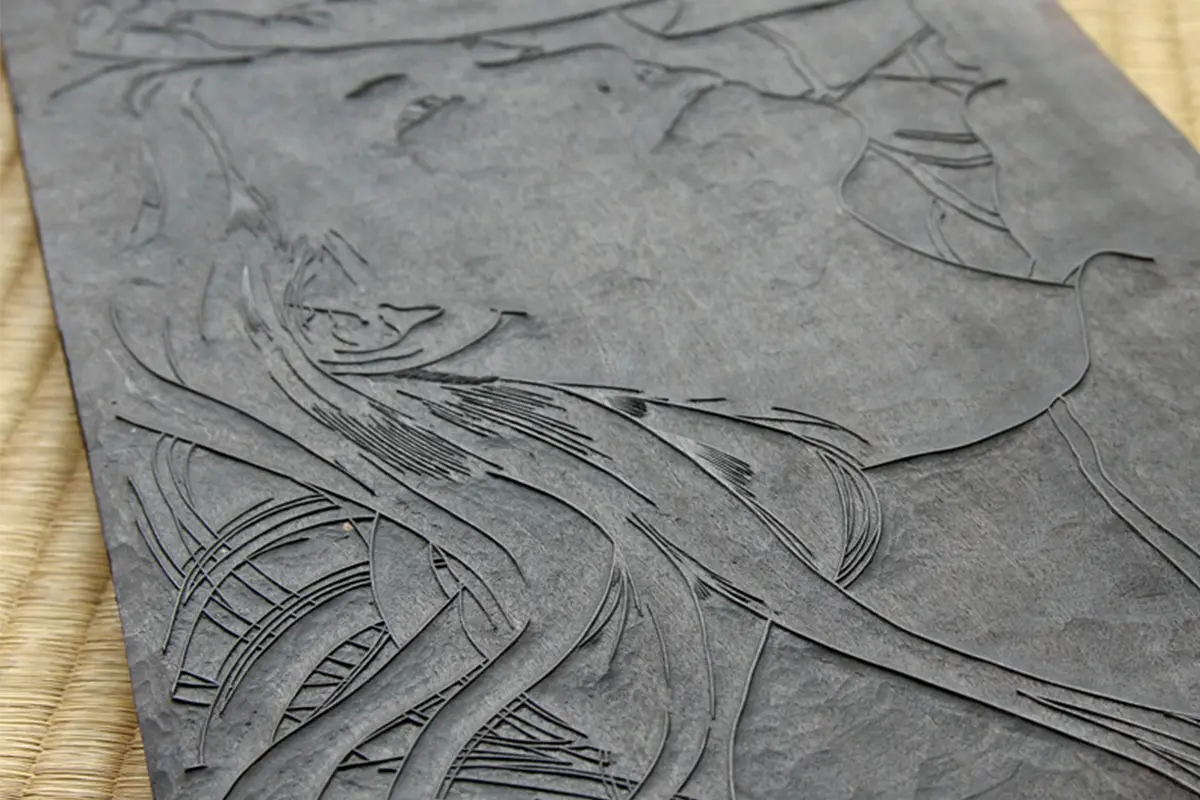 In portraits of beautiful women called bijin-ga, the contours play an important role in creating the rich expressions of the women. Using woodblocks made from the hard wood of the wild mountain cherry tree, the carver faithfully carves the smooth lines drawn by Mr. Ikenaga. Like the bijin-ga produced by the ukiyo-e artist Utamaro, the hairline is where the carver shows off his skill.