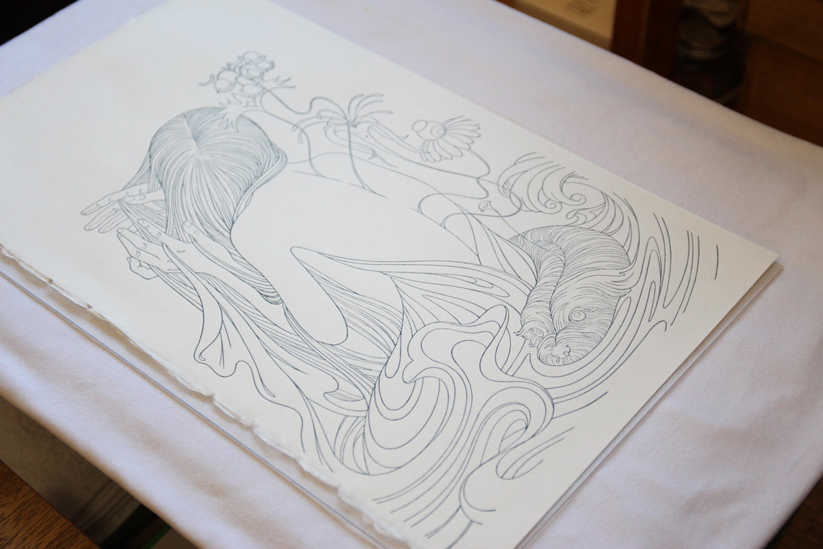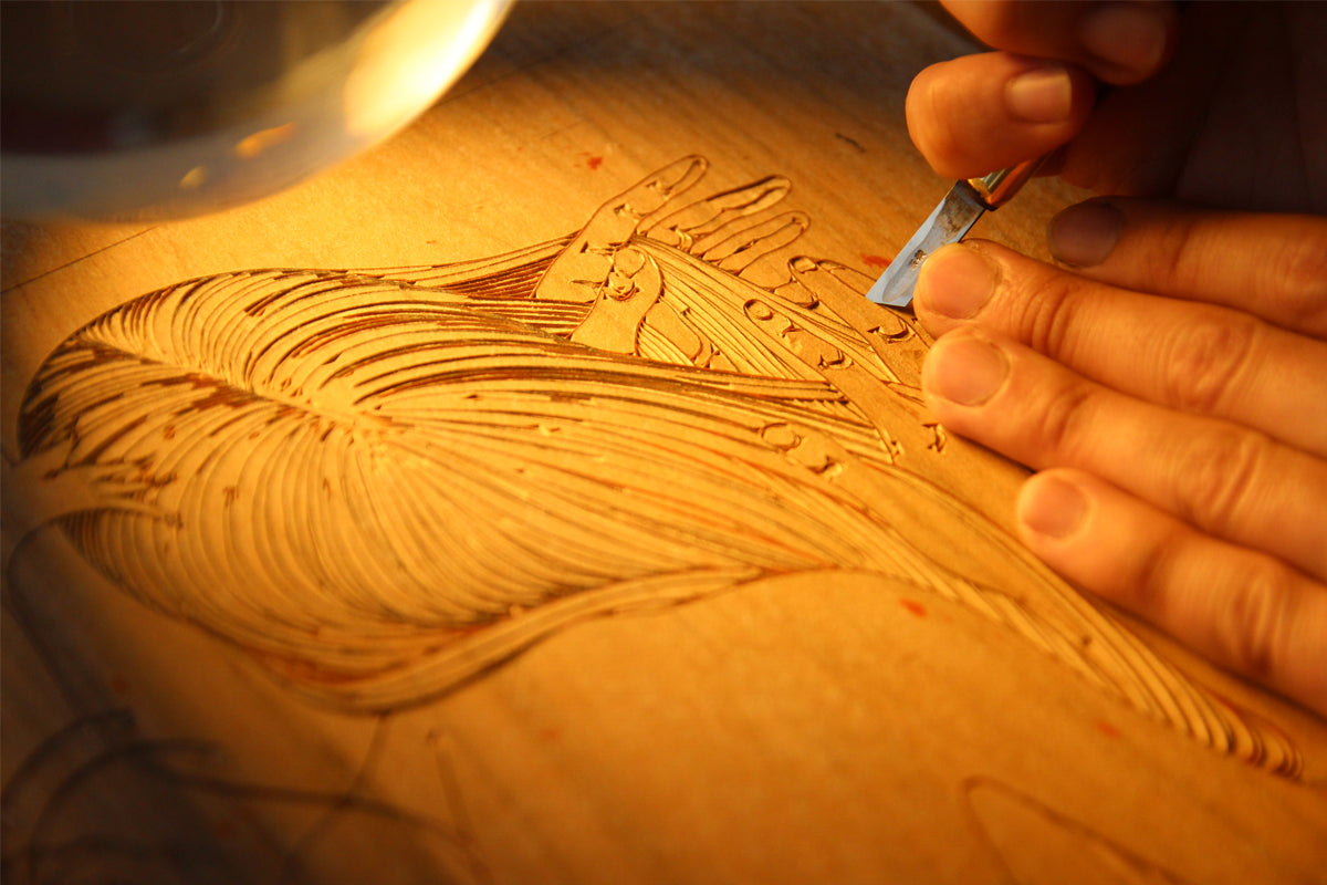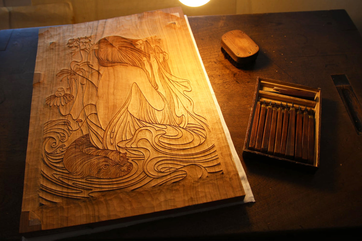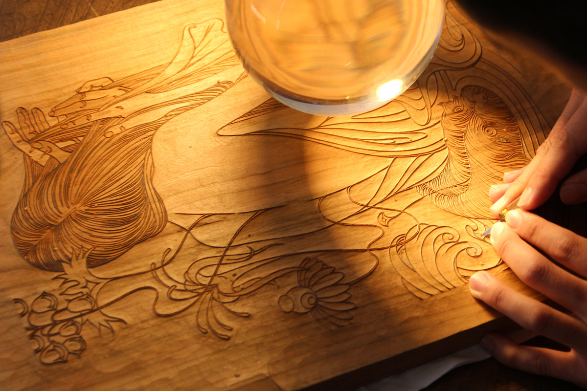 Always viewing everything in the universe from his own unique perspective, James Jean fluidly expresses his world view through beautiful lines. The carver deciphers the intention of the artist, James Jean, and rhythmically carves the gracefully flowing lines. The carver's intense focus and precision is required for the work of carving delicate lines with a single knife.