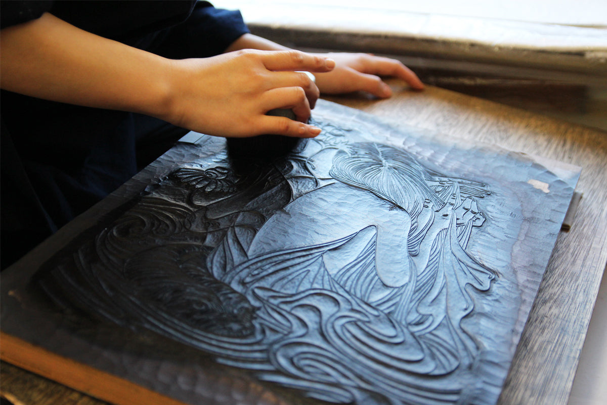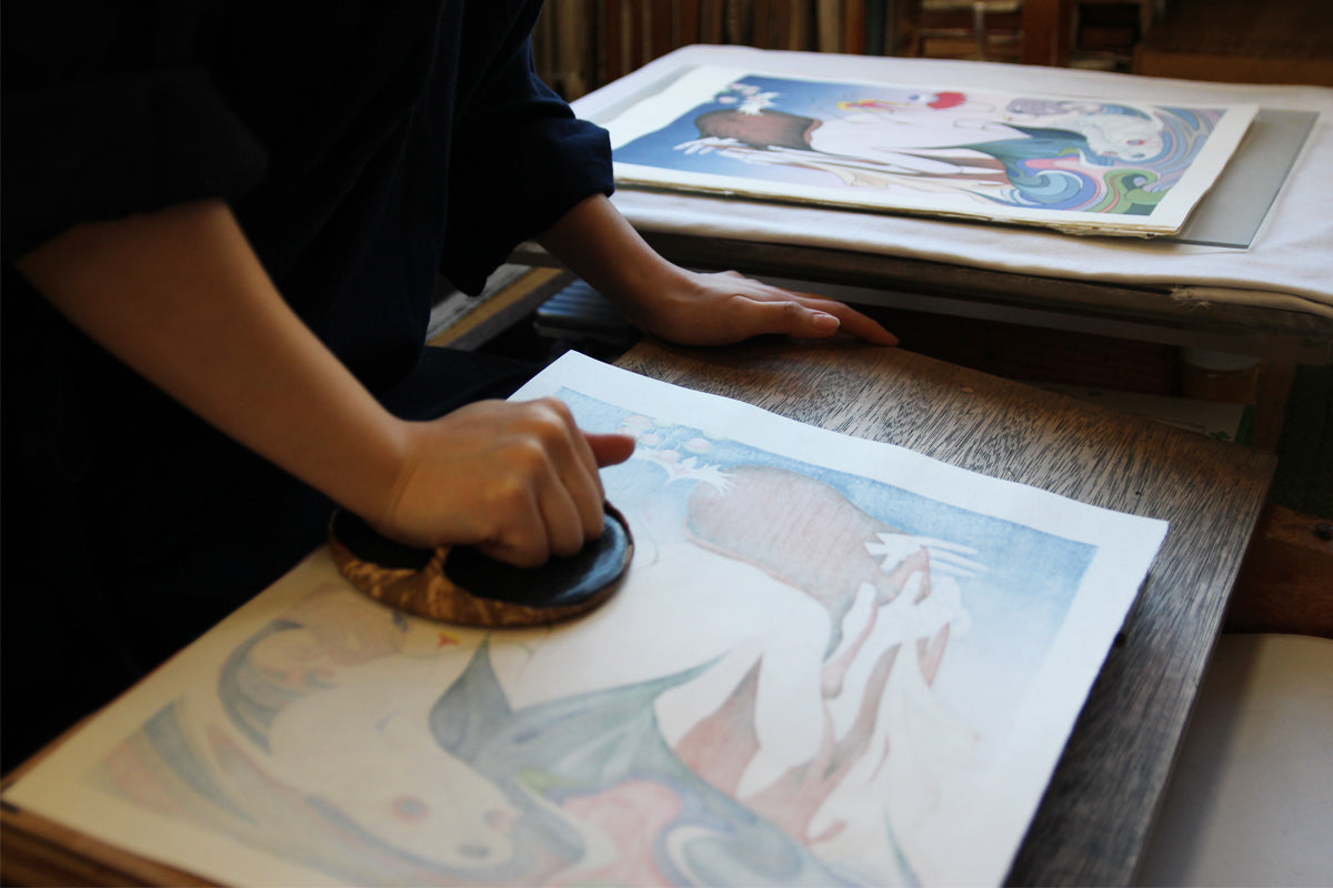 The light and brilliant colors of traditional woodcut prints is produced by using a Baren rubbing pad to rub water-based colors into the fibers of the paper, which is carefully handcrafted from paper mulberry. The printer feels the world view of Jean and his artwork "Chine" as he mixes and prints the colors on top of one another.