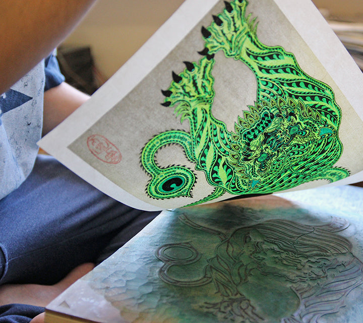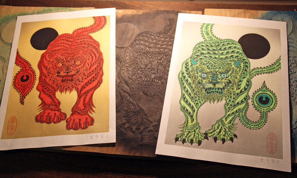 Based in Yamagata, Tomiyuki Kaneko is an up-and-coming artist whose works portray an ethereal universe of spirits, monstrous creatures and divine beings. Through traditional woodcut printing techniques, Mr. Kaneko's universe of divine beasts has now been brought to life in brilliant colors as "Red Tiger/Blue Tiger."