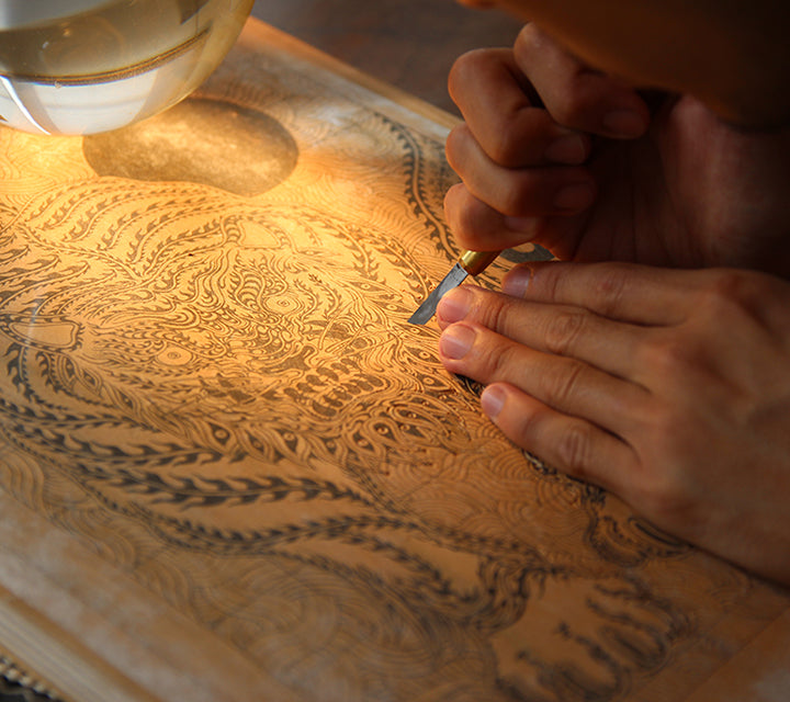 Mr. Kaneko's vibrant lines are carved out rhythmically. With extreme focus and precision, the carver keeps true to the artist's brushwork and uses a single knife to carve the lines.