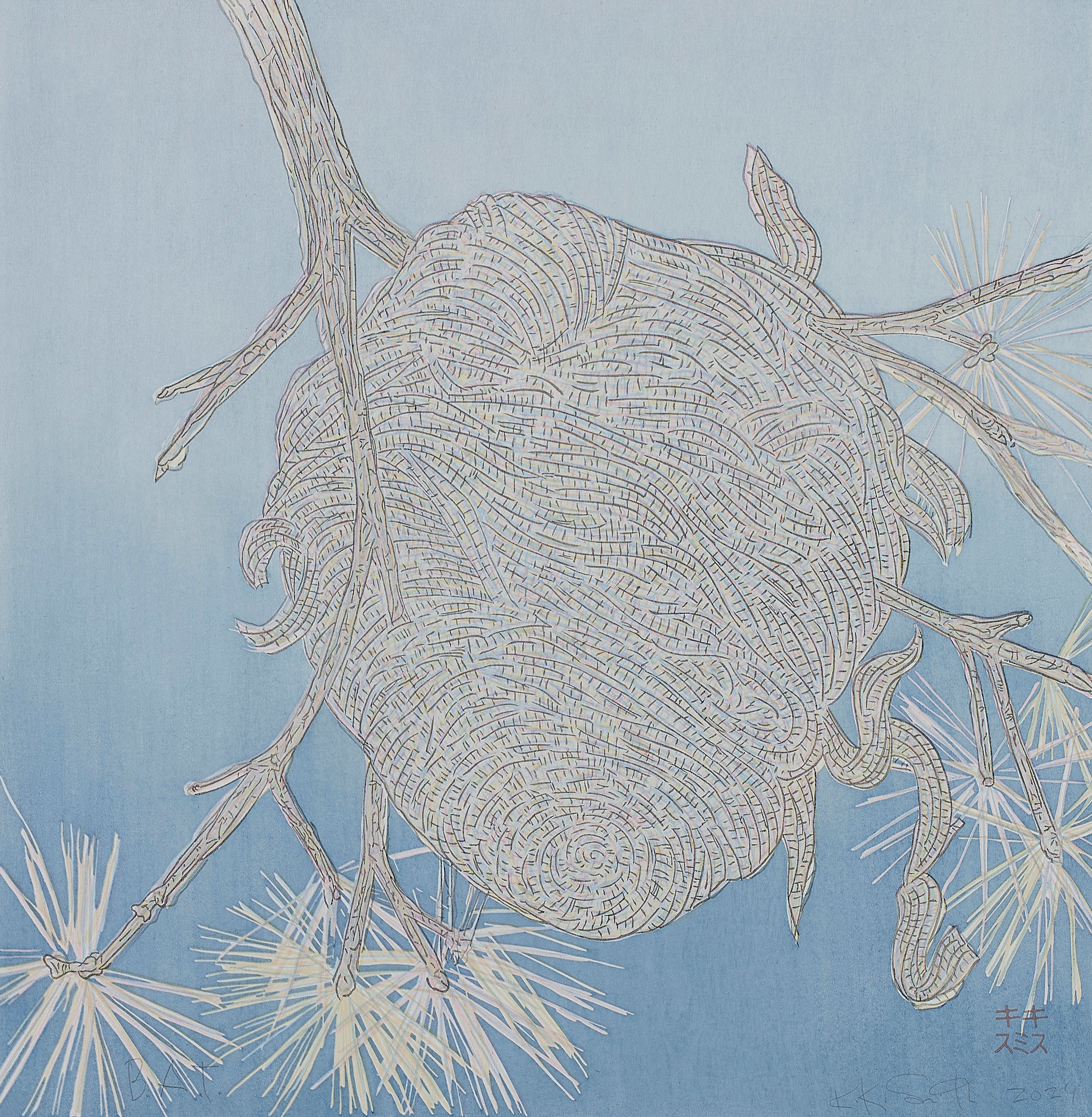 The woodcut print Paper Wasps Nest, produced through Smith’s collaboration with the Adachi Institute of Woodcut Prints, depicts a wasps’ nest on a pine branch. For this work, the team set out to reproduce the four-color system used in modern printing — known as CMYK for cyan (C), magenta (M), yellow (Y), and black (K) — using the traditional woodcut technique of layering water-based pigments on washi paper. The result demonstrates what becomes possible when an artist’s original vision meets the highly refined skill of today’s master carvers and printers, opening up new horizons in woodcut printmaking.