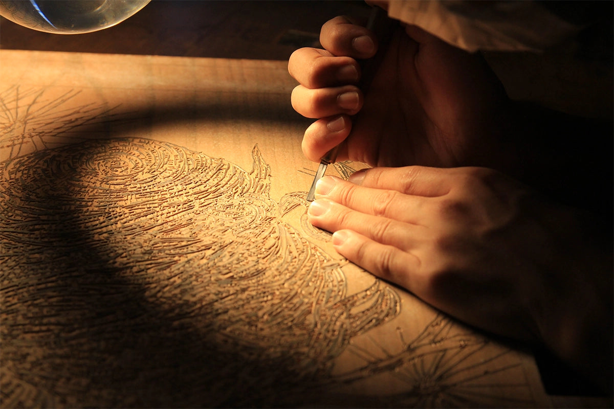 With complete command of the small kogatana cutting knife regarded as the very soul of his craft, the carver worked rhythmically to cut the hard mountain cherry blocks. During production, Kiki Smith joined online meetings, and the carver and printer talked through the finer details directly with the artist.