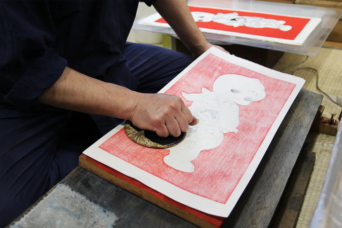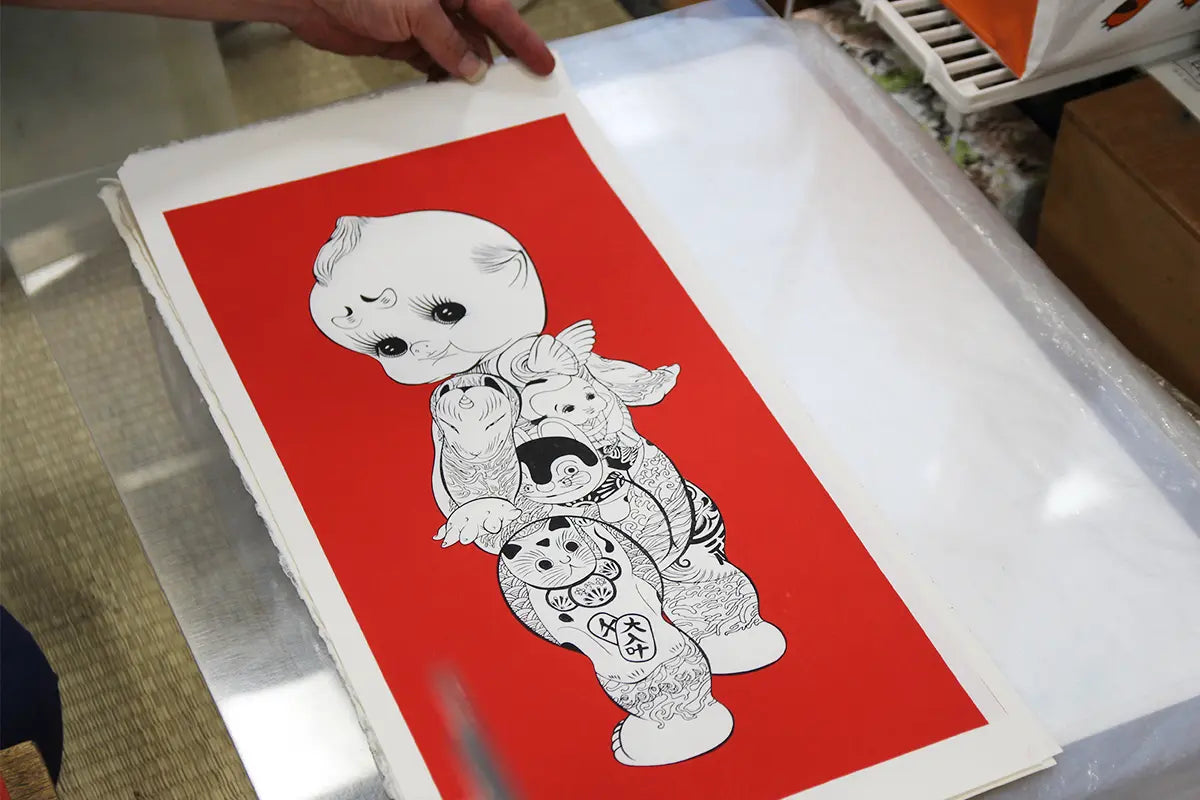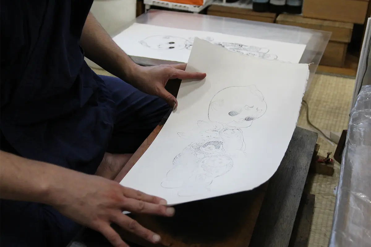 Artist Kumi Machida depicts the dissonance and anxiety of contemporary society through a surreal visual language. She uses traditional Japanese art materials and typically paints with a menso brush, designed for extremely fine lines. Her strong sumi ink lines emerge from the meticulous layering of many thin strokes. This project challenged contemporary artisans to convey the distinctive tension of Machida’s linework through woodcut printing.