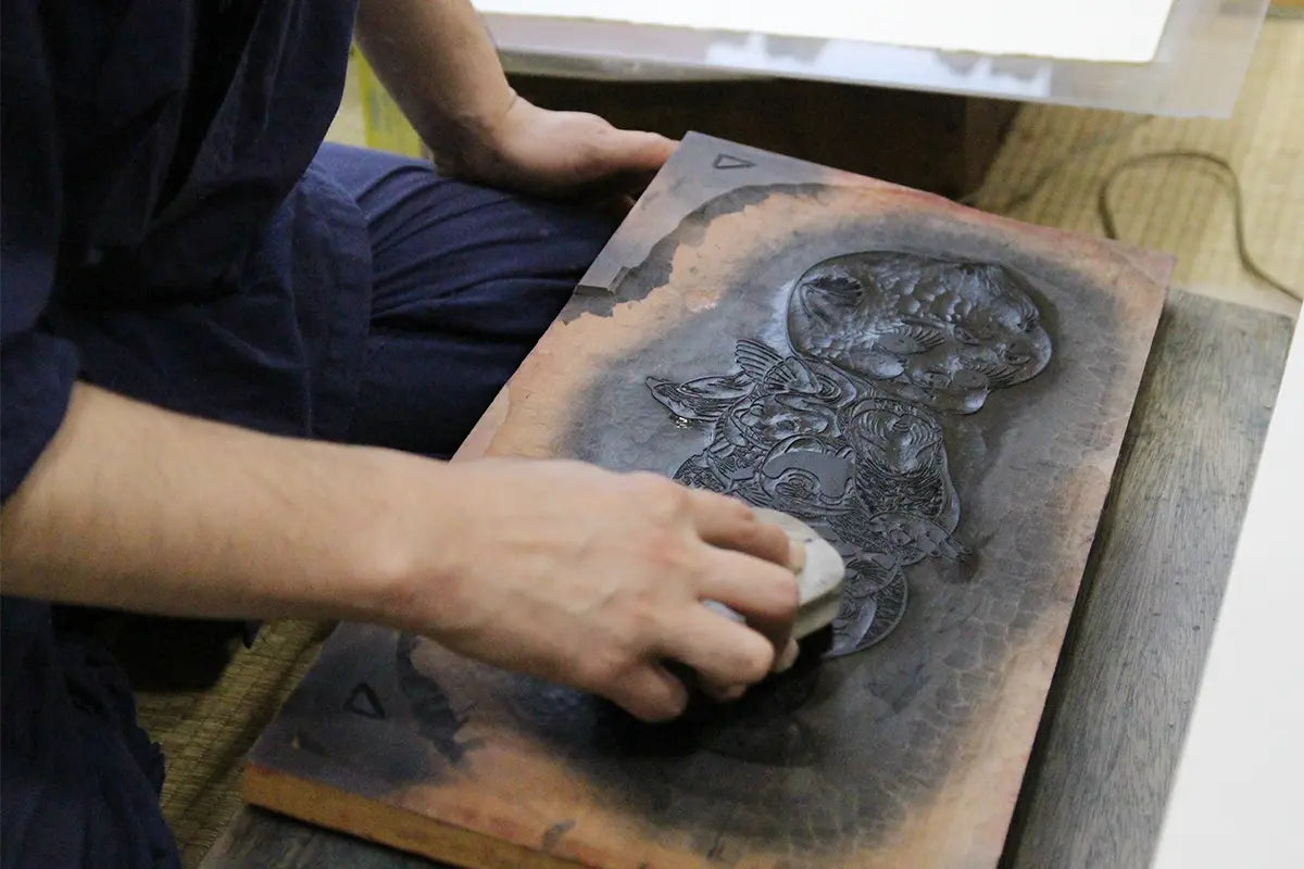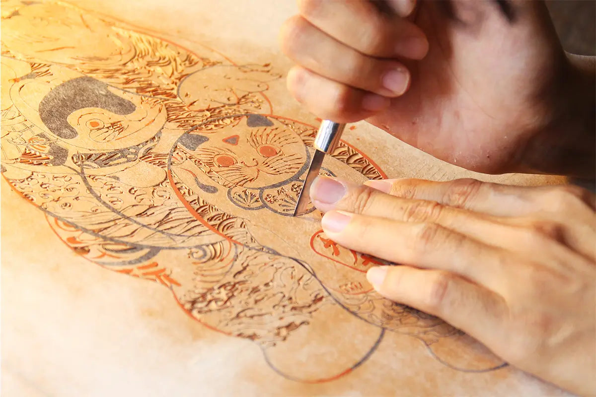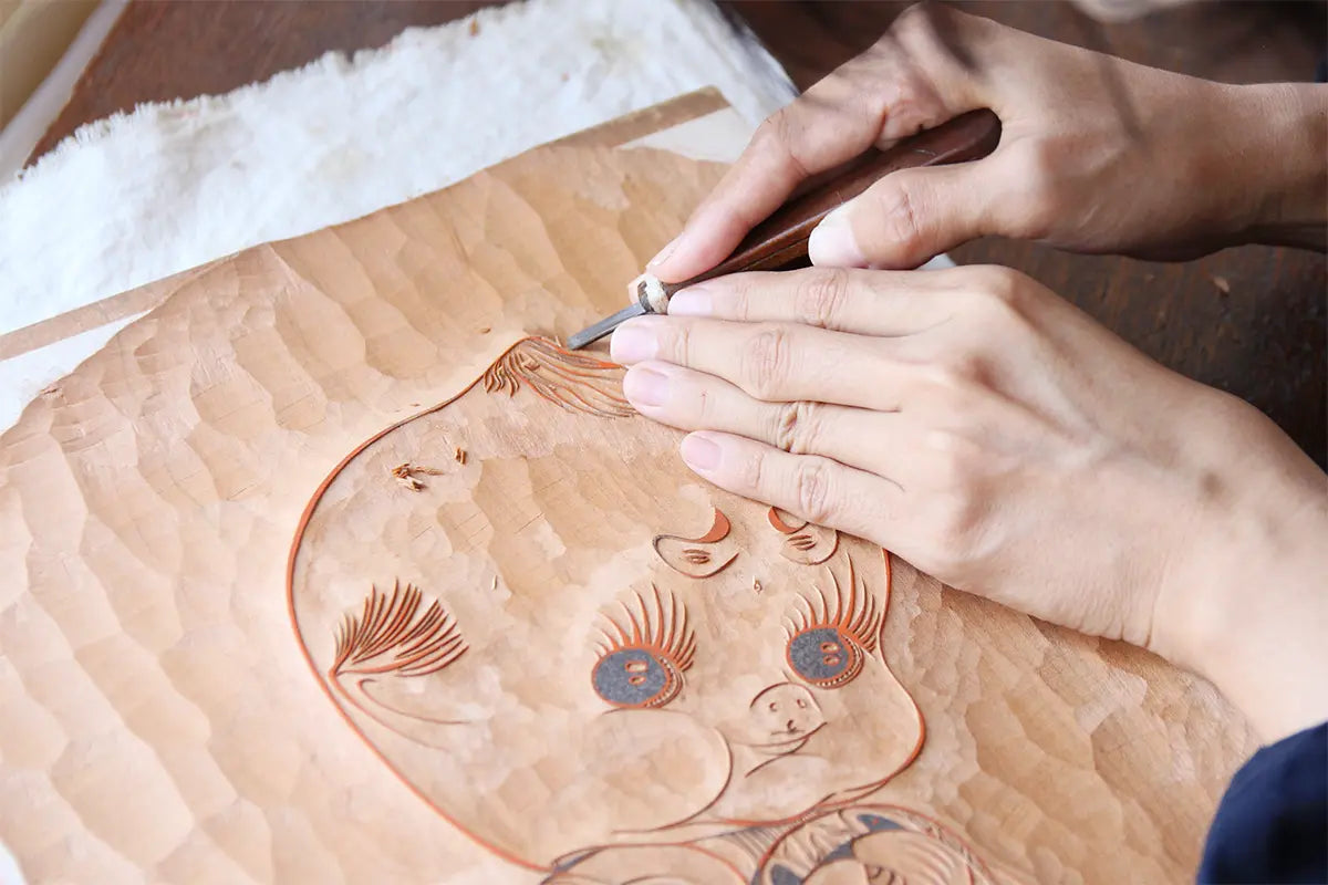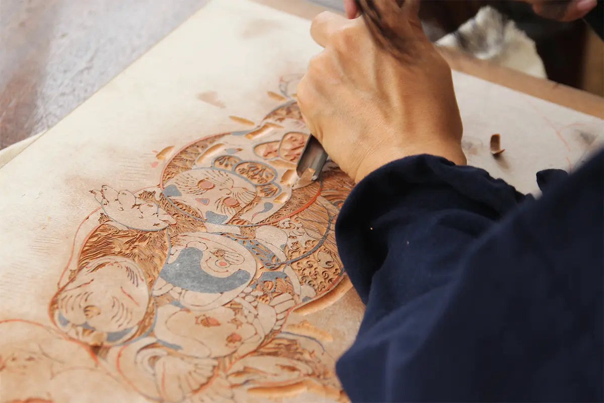 Artist Kumi Machida depicts the dissonance and anxiety of contemporary society through a surreal visual language. She uses traditional Japanese art materials and typically paints with a menso brush, designed for extremely fine lines. Her strong sumi ink lines emerge from the meticulous layering of many thin strokes. This project challenged contemporary artisans to convey the distinctive tension of Machida’s linework through woodcut printing.