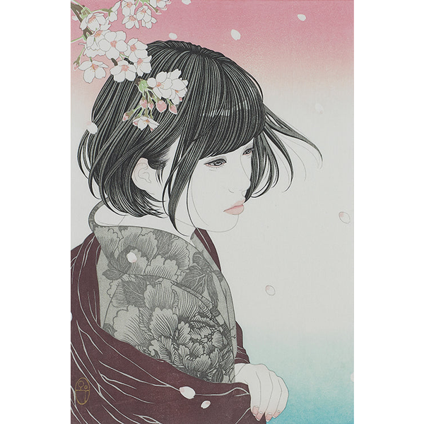 Miyazaki's paintings of beautiful women have an elegant atmosphere, which is expressed through soft and transparent colors. Making use of the texture of Japanese paper, the world view of Miyazaki's work is printed with care.