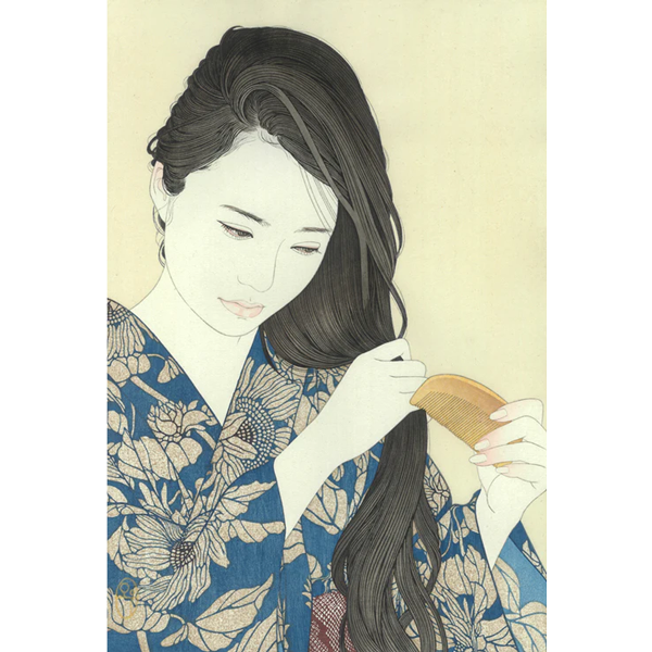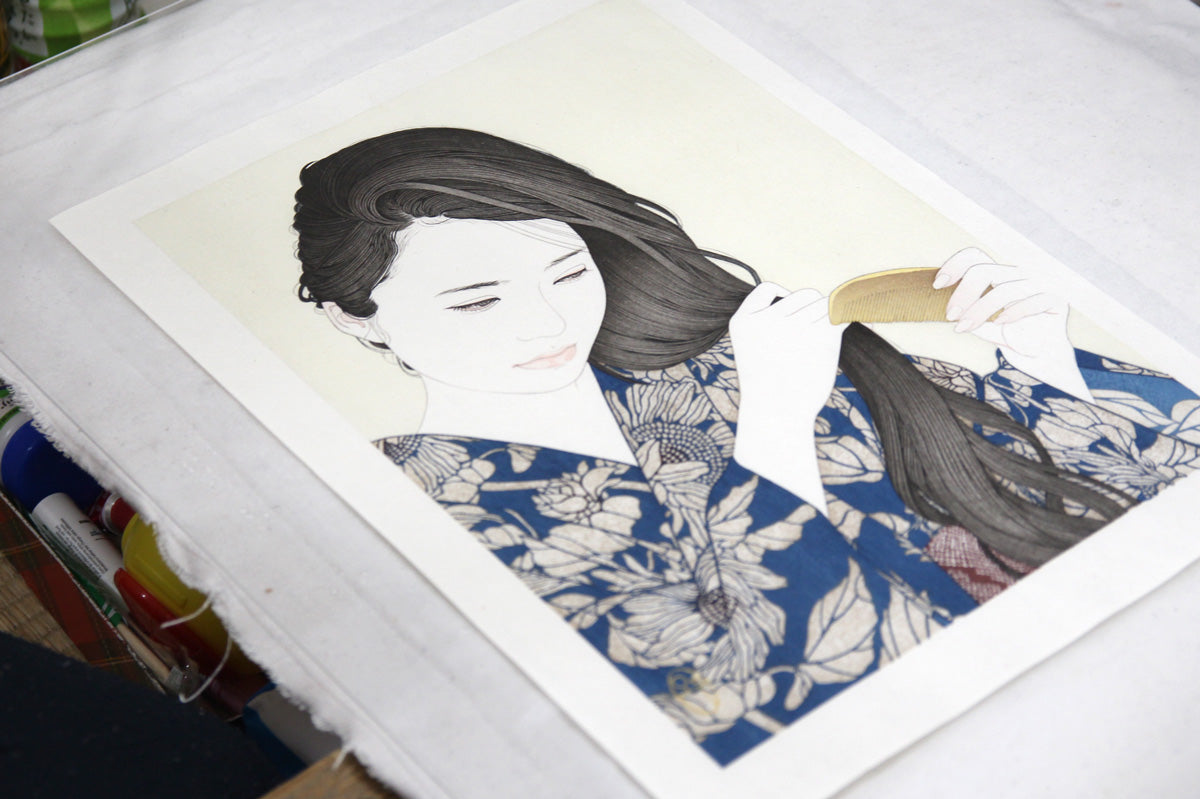 Yu Miyazaki is a Japanese-style painter who has fascinated many people with her "bijin-ga" ("portraits of beautiful women") with delicate lines and soft colors. She received the grand prize at the 9th Adachi Contemporary Ukiyo-e Award, and her first woodcut print "Full Bloom - Hanazakari" that she created with contemporary carvers and printers received high acclaim. Five years later, she worked with modern artisans once again to create her second woodcut print, "Rich Black Hair Flowing Through Her Comb." A tribute to Hashiguchi Goyo, who was called the "Utamaro of the Taisho era,'' this work embodies the elegance of bijin-ga that has been passed down through history.