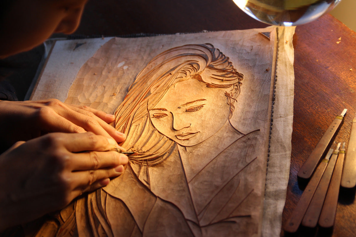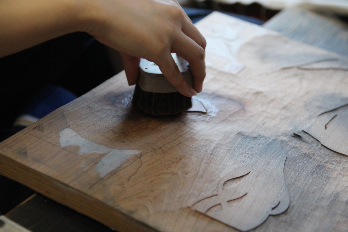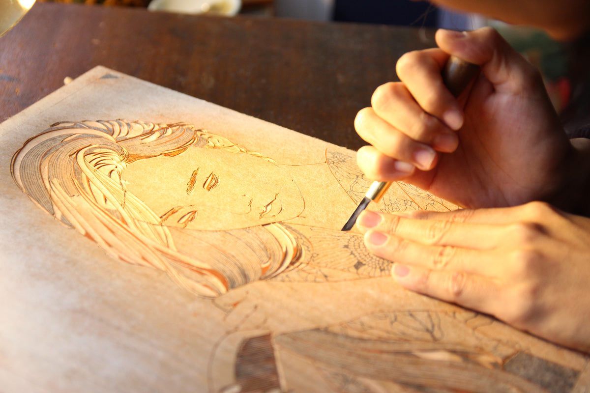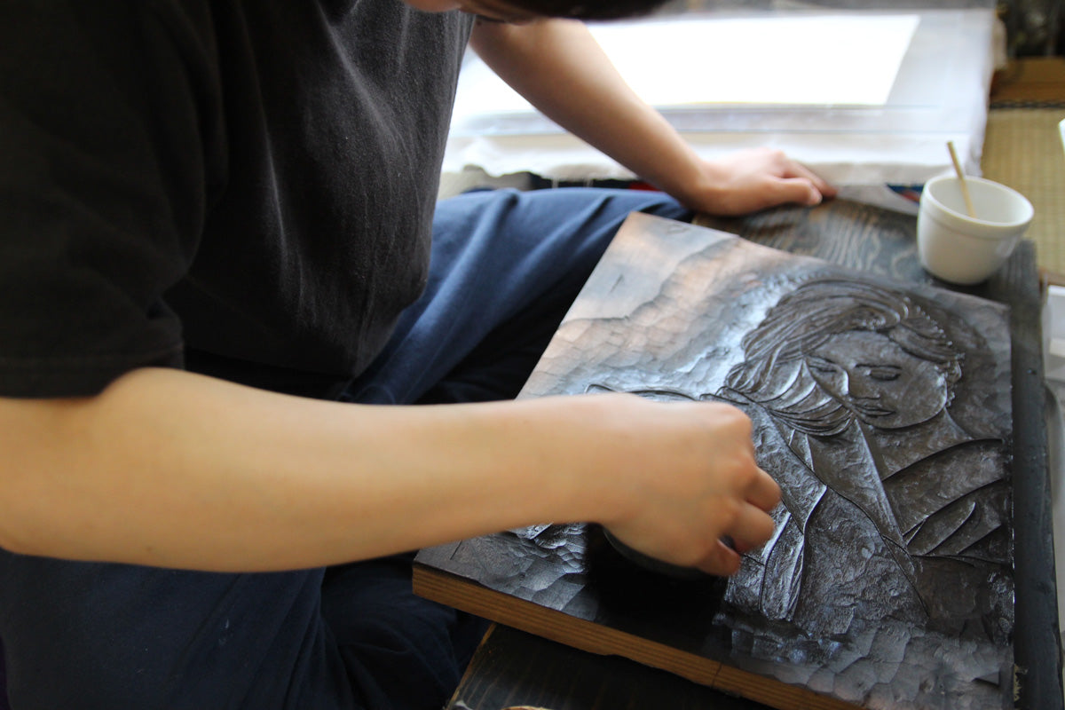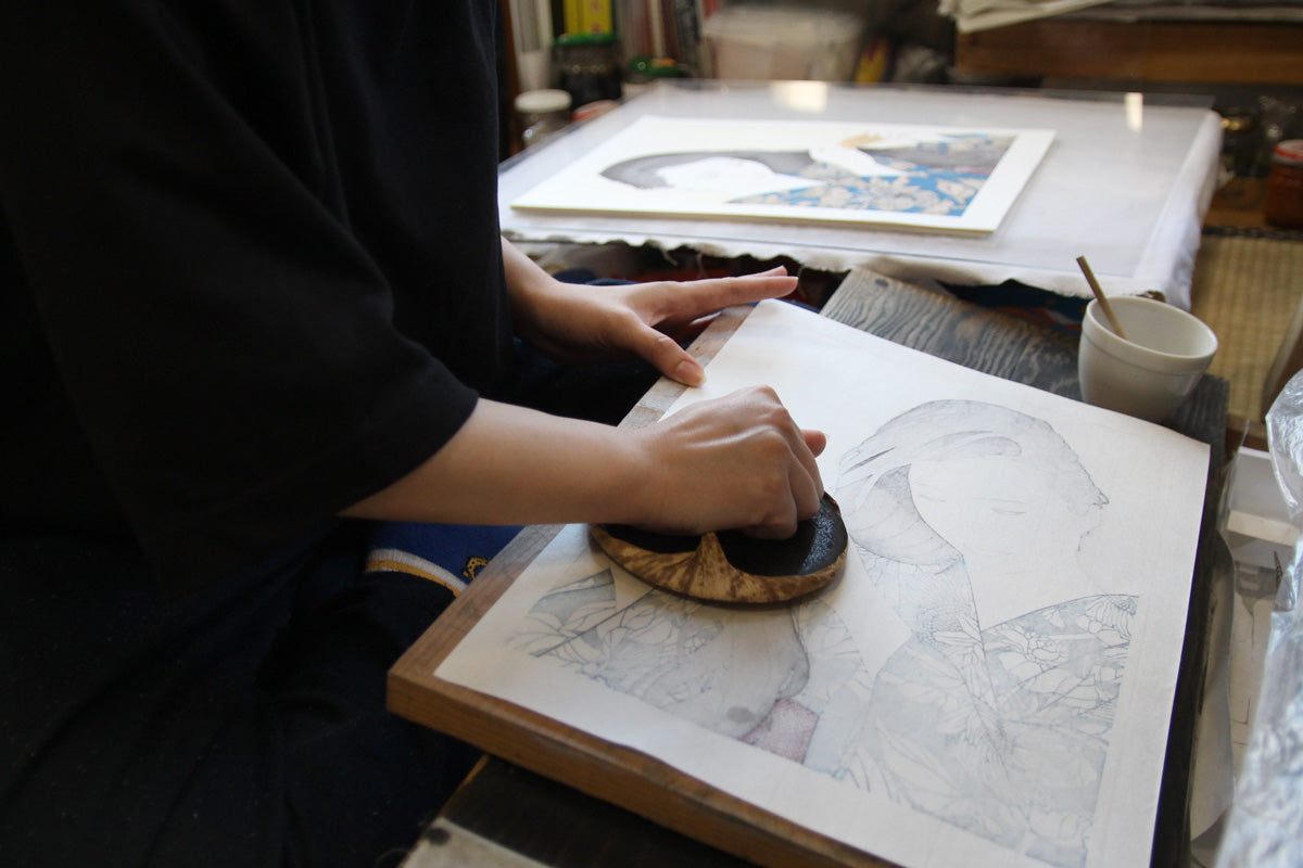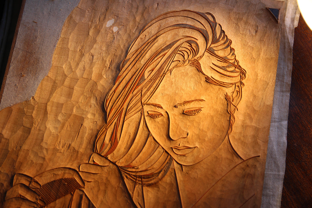 The expression of hair in bijin-ga has been passed down from the ukiyo-e of the Edo period and the "shin-hanga" ("new woodcut prints") of the Taisho era. In this work, Miyazaki focused most on the lines of the flowing black hair. The lines of the hair of the Reiwa era beauty were carved while paying respect to the artists and artisans of each era.