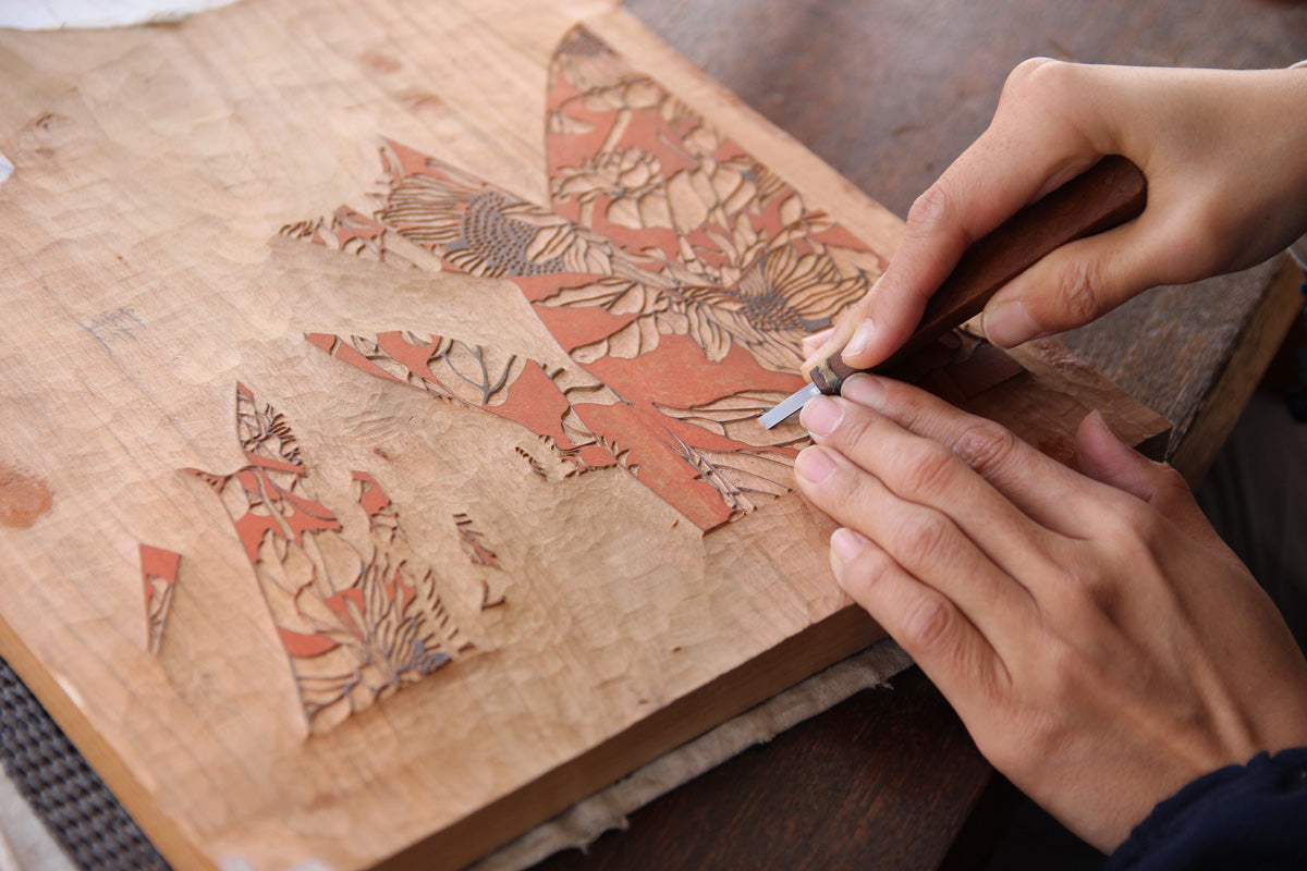 Elegance created by the texture of Japanese paper and the soft color of woodcut prints