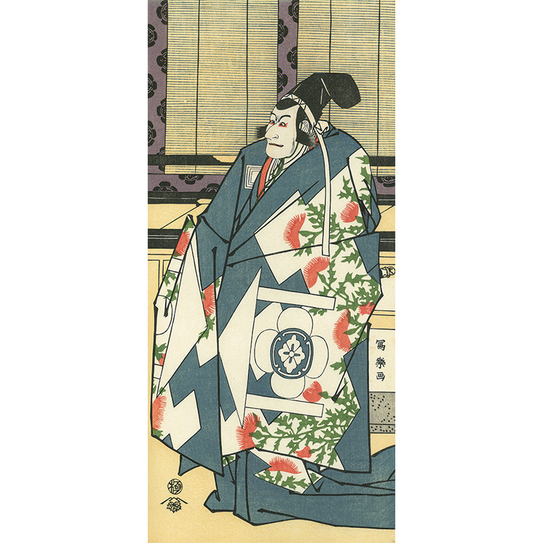 During this period, Sharaku produced aiban-format prints featuring half-length portraits with kitsubushi (yellow fill) backgrounds, while continuing to produce full-body hosoban-format prints as in the second period. A notable shift from the previous phase is the inclusion of backgrounds in the hosoban prints. This period is marked by a more decorative style, with a vibrant and ornate visual character.