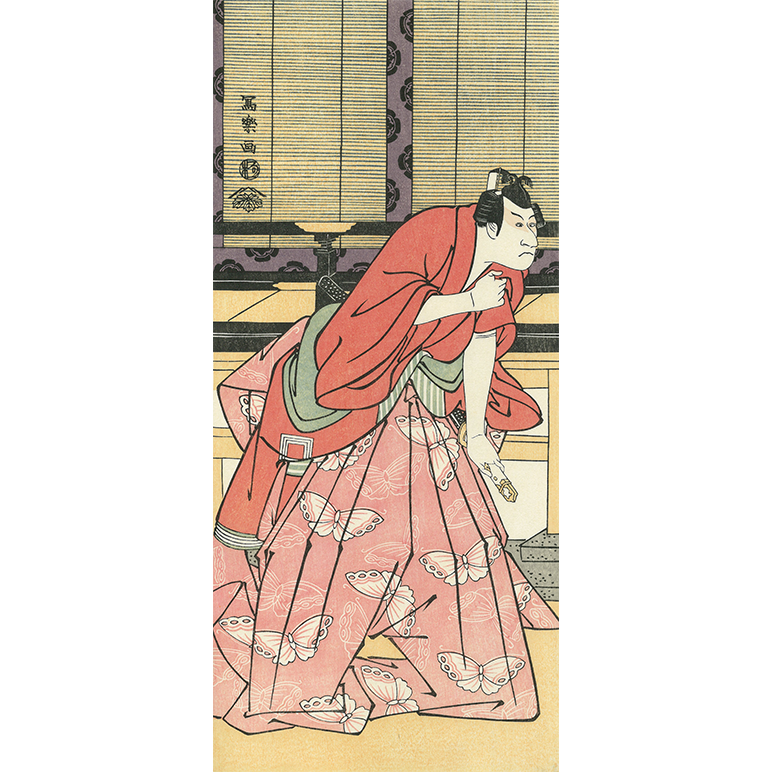 The works from Sharaku’s fourth and final period consist of hosoban-format prints based on comedic New Year’s plays staged in January 1795. In this phase, he further refined the background details introduced in his third-period hosoban works, rendering them with even greater intricacy. These descriptive backgrounds emphasize the fact that the scenes are on stage, while by contrast, lines depicting the actors and their costumes became noticeably simpler.