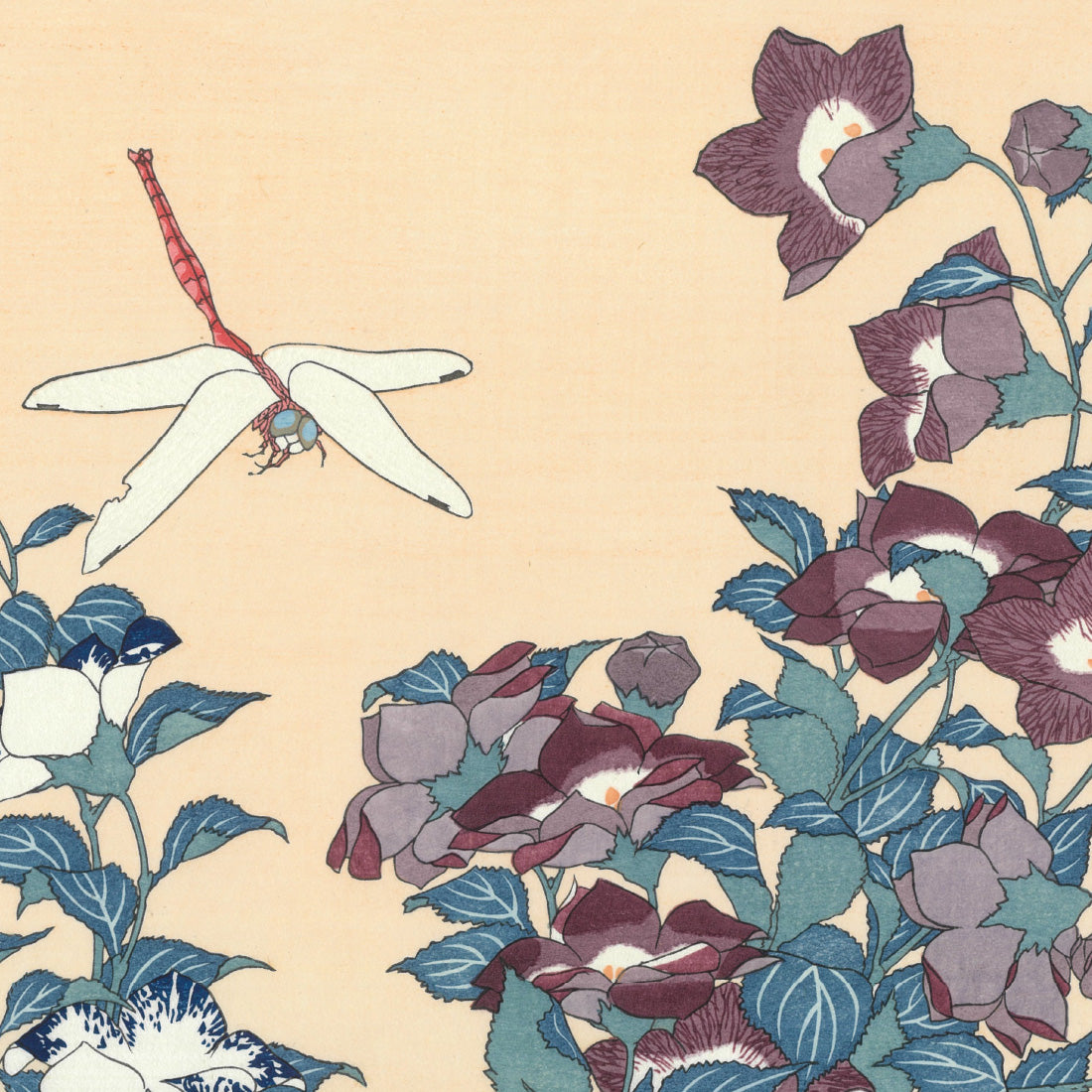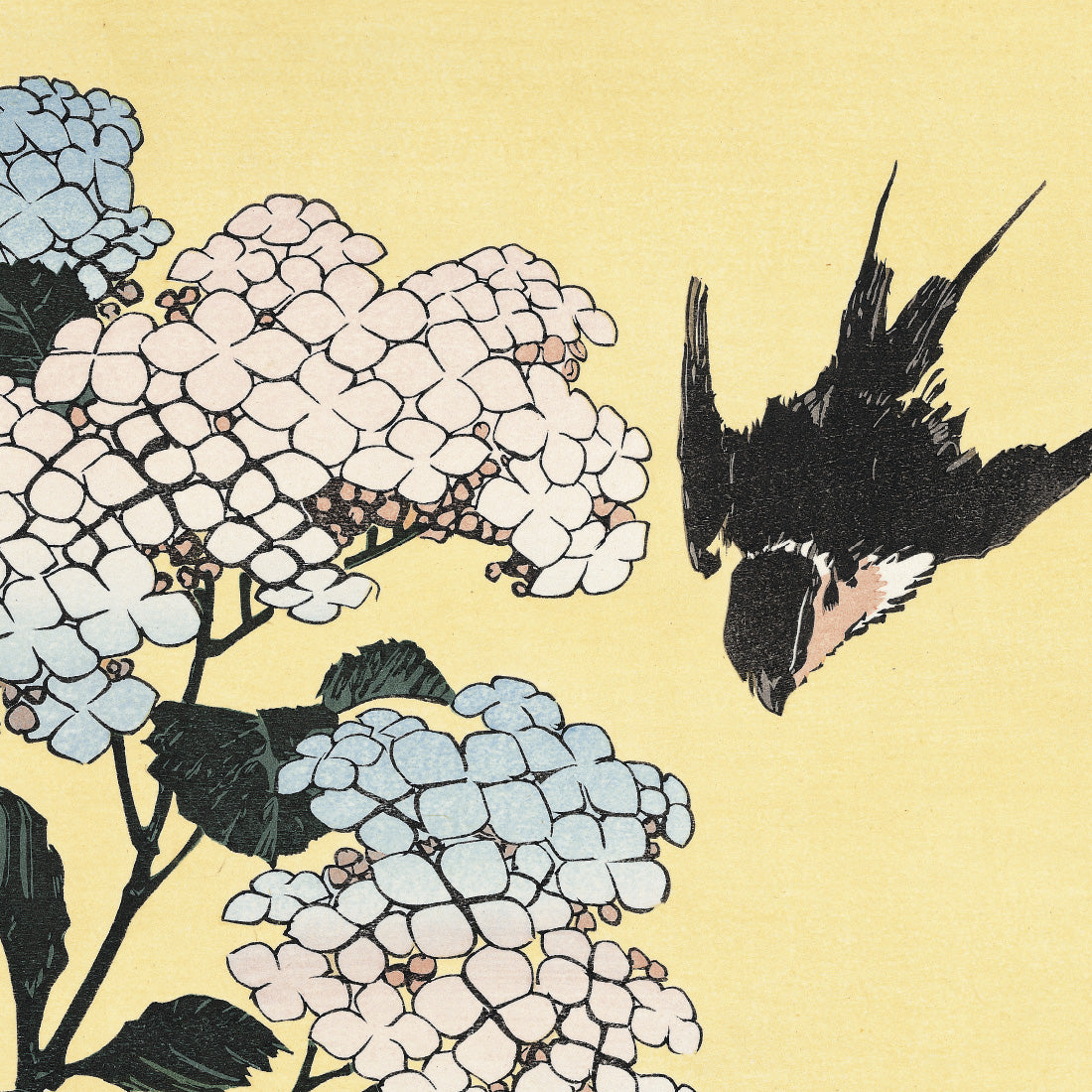 This is a season when you can enjoy the changing scenery, such as hydrangeas glistening in the rain and dew that can only be seen during the rainy season, and morning glories that add color to the full-fledged summer season. Ukiyo-e of this season depict not only seasonal flowers but also migratory birds such as siskins and meadow buntings and seasonals birds such as kingfishers.