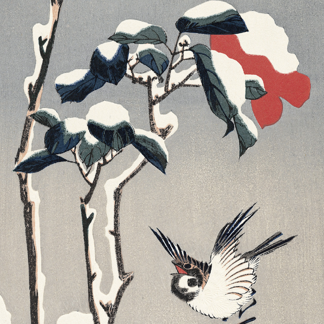 Even in the quiet winter, we can feel the breath of life beneath the snow and ground preparing for the coming spring. In ukiyo-e, bamboo grass and camellias are depicted along with familiar winter birds. The whiteness of the snow is often expressed through the surface of the Japanese paper itself, creating a beautiful contrast with the color of camellias and other flowers.