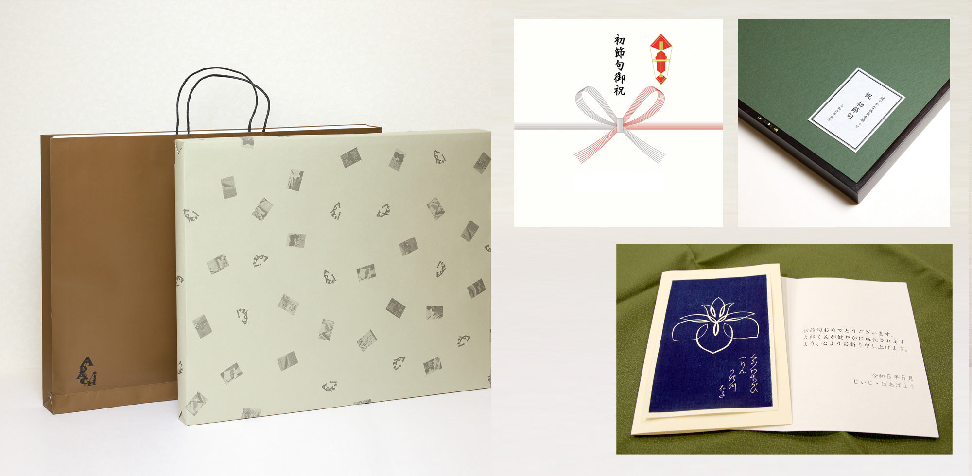 An unframed print is set in the Adachi original ukiyo-e envelope and a framed print is set in the box and wrapped with Adachi Original wrapping paper.