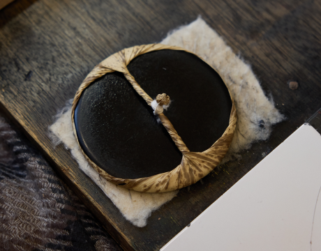 The baren rubbing pad is a unique tool for the woodcut printing and used to impress pigments into the delicate fibers of washi paper. The baren rubbing pad consists of three parts, the case made of thick layers of washi paper, the woven rope made of bamboo skins and the wrapper made from bamboo skins.