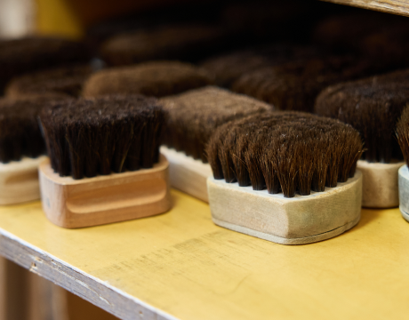 The printer uses different size and shape of brushes for the areas where he applies the colors on the woodblock. Horse hair is used for these brushes.